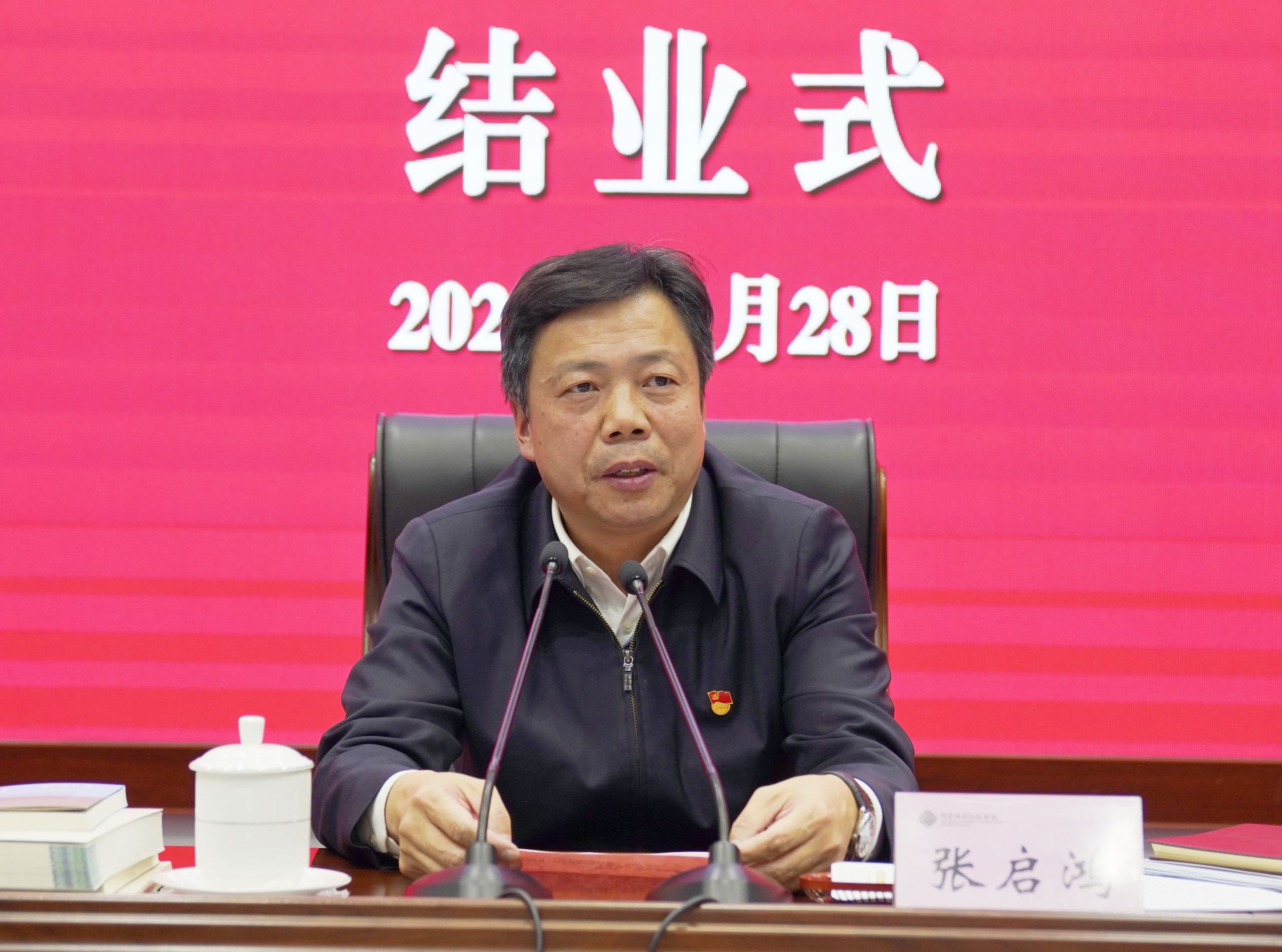 结业仪式上,张启鸿作总结讲话。他指出,本次培训时机选得好、内容设计得好、取得的成效好,达到了提高站位、扩宽视野、提升能力、激发干劲的预期目的。当前是学校爬坡过坎、奋勇向前,实现高质量发展的关键时期,就切实把学习成果转化为工作动力和实际成效,他提出三点要求:一是要聚焦学深悟透、生动实践,持之以恒深入学习贯彻习近平新时代中国特色社会主义思想。要在认知上找差距,进一步把握职业教育发展、行业产业发展大势,面对学校未来发展树立全校上下“一盘棋”的大局意识。要在措施上找短板,进一步完善、调整制定的政策措施,更好地适应学校高质量发展需求。要在落实上找问题,始终把狠抓落实作为全部工作的主基调,强化作风建设,杜绝不严不实的问题。二是要聚焦政治过硬,实干担当,持之以恒加强高素质专业化干部队伍建设。要提升“政治三力”,从党和国家工作大局出发,把贯彻党中央精神体现在谋划事业发展、部署重大任务、推进重大工作上。要提升专业能力,不断加强业务学习,使知识体系、专业能力与形势发展相适应、与岗位要求相匹配,不断拓宽形成加快学校高质量发展的新点子、好办法。要提升做大事成大事能力,思考工作中应该“做什么”“怎么做”“做多好”,以“功成不必在我”的精神境界和“功成必定有我”的历史担当开拓创新。要提升带队伍能力,用管用的办法把大家发动起来,把团队干事创业的精气神提振起来、鼓舞起来。要提升守住底线能力,绷紧纪律规矩这根弦,自觉接受监督,清清白白做人、干干净净做事。三是要聚焦重点任务、攻坚克难,持之以恒以高质量党建引领事业高质量发展。坚持落实立德树人根本任务,建设技术技能人才的培养高地,坚持以“双高”“特高”建设为抓手,持续深化改革,推动学校高质量发展,坚持全力申办职业本科学校,努力创建高水平技能型大学,坚持强化党管人才,持续推进人才强校战略,坚持强化绩效导向,积极落实分类发展考核要求。