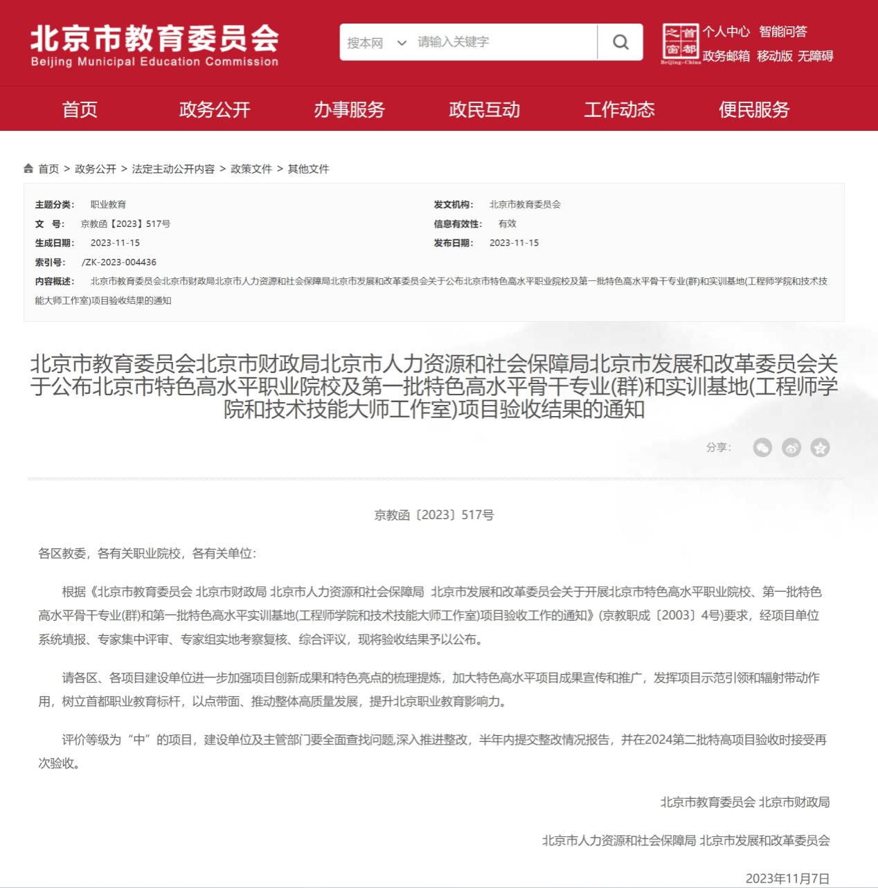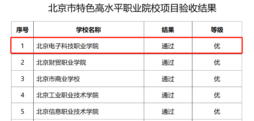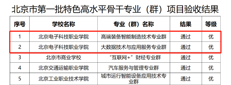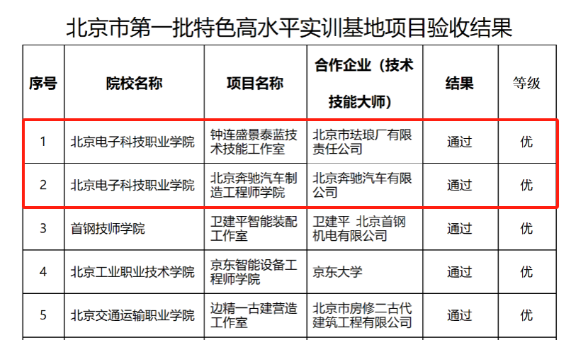 2023年11月15日,北京市教委、市财政局、市人社会局、市发展改革委联合发文《关于公布北京市特色高水平职业院校及第一批特色高水平骨干专业(群)和实训基地(工程师学院和技术技能大师工作室)项目验收结果的通知》,BEAT365北京市特色高水平职业院校、高端装备智能制造技术专业群、大数据技术与应用服务专业群、钟连盛景泰蓝技术技能工作室、北京奔驰汽车制造工程师学院等第一批特高项目全部顺利通过验收并获优秀等次。