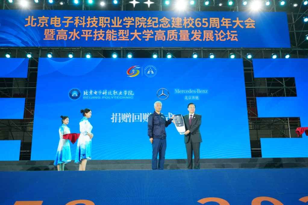 作为65 周年校庆的献礼,北京奔驰专门送来两辆教学用车。大会现场进行了校企双方捐赠及回赠仪式。