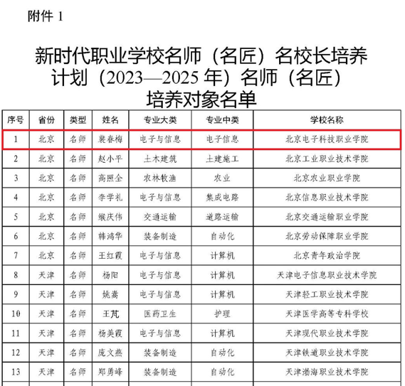 为不断加强职业学校教师校长队伍建设,全面落实《关于深化现代职业教育体系建设改革的意见》文件精神,根据《教育部 财政部关于实施职业院校教师素质提高计划(2021—2025年)的通知》(教师函〔2021〕6号)要求,教育部决定实施新时代职业学校名师(名匠)名校长培养计划(2023-2025年)。经自主申报、省级教育行政部门推荐、专家综合评议等,确定210人为高等职业院校名师(名匠)培养对象。