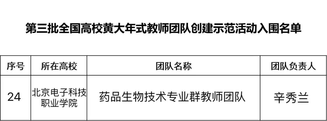 “全国高校黄大年式教师团队”是教育部为贯彻落实习近平总书记对黄大年同志先进事迹重要指示精神,全面深化新时代高校教师队伍建设改革的国家级教师团队建设工程。在2023年8月31日召开的新闻发布会上,教育部正式发布了第三批“全国高校黄大年式教师团队”创建示范活动入围名单,北京电子科技职业学院副院长辛秀兰教授领衔的药品生物技术专业群教师团队成功入围。