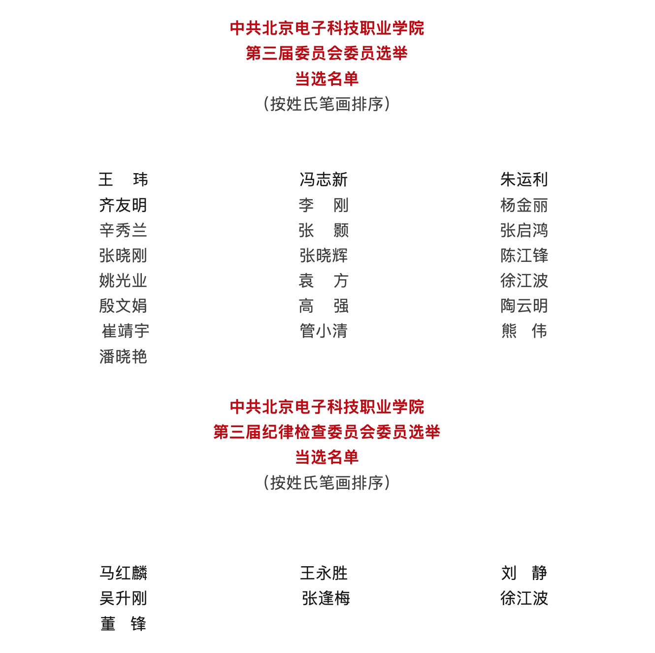 到会的105名代表以无记名投票方式选举产生了中共北京电子科技职业学院第三届委员会委员22人、中共北京电子科技职业学院第三届纪律检查委员会委员7人。王玮宣布了新当选的第三届党委委员和纪委委员名单。
