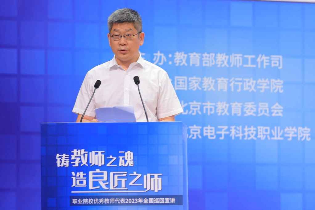 教育部教师工作司副司长黄小华、国家教育行政学院教师工作与研究部主任于维涛、北京市教委人事处处长宋晓晖等出席活动,北京电子科技职业学院党委书记张启鸿出席并致辞。教育部、国家教育行政学院、北京市教委相关处室领导,来自北京市高职院校的师生代表、企业代表等300余人现场聆听宣讲,活动同步进行线上直播。宣讲会由北京电子科技职业学院副院长辛秀兰主持。