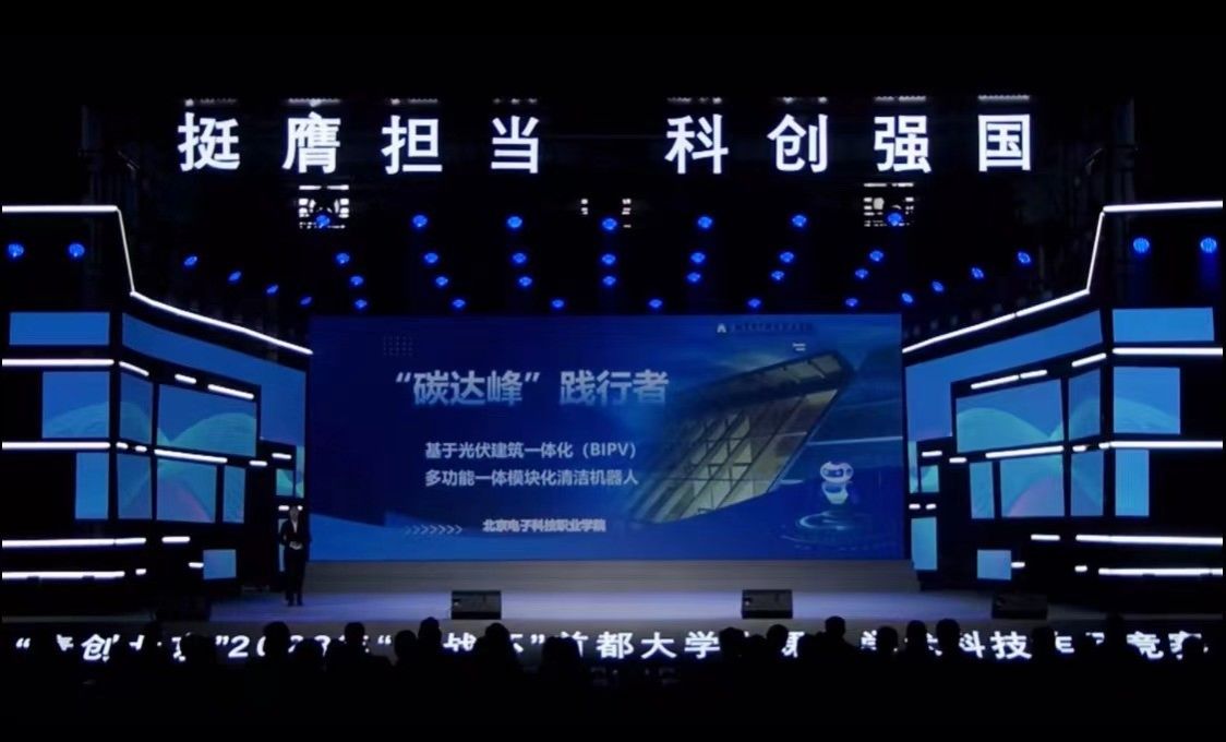 闭幕式上,经济管理学院张晓妮同学作为全市4个路演项目之一进行作品展示,介绍团队在光伏电板清洁机器人领域的研究成果,该项目也作为学校的代表性项目,在“挑战杯”闭幕式实物展上展出。