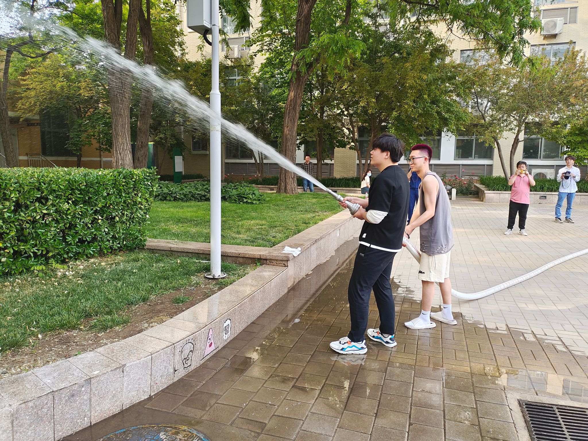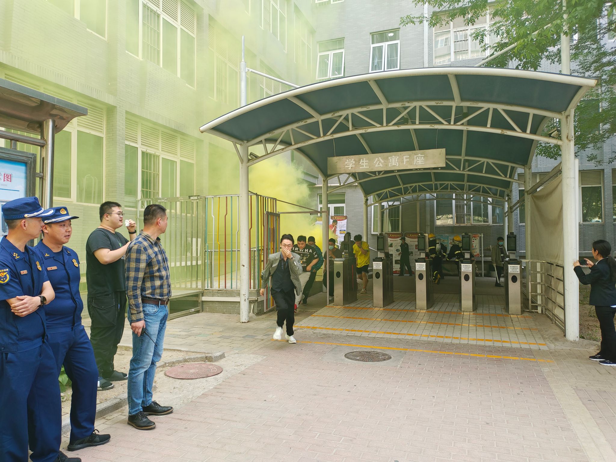 下午3时,演练总指挥朱运利下达演练开始命令。演练现场模拟学生公寓五层发生火情,接到火情信息后,各参演单位按照职责和分工,迅速到位展开工作。保卫处立即组织微型消防站、义务消防队赶赴现场,启动火灾应急预案。听到消防广播提醒后,学生公寓F、G楼参加演练的师生,按照预案规划路线快速撤离,安全疏散至集结点。