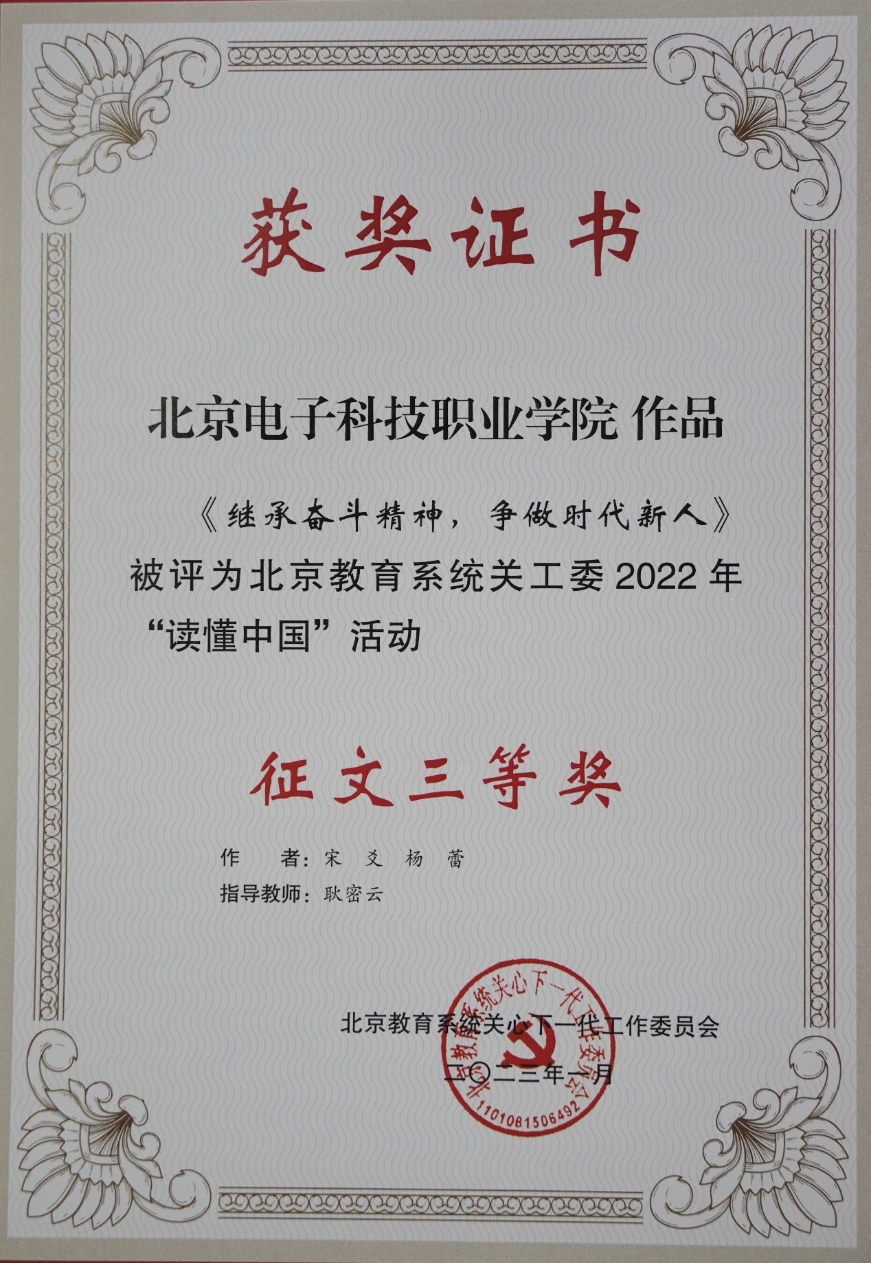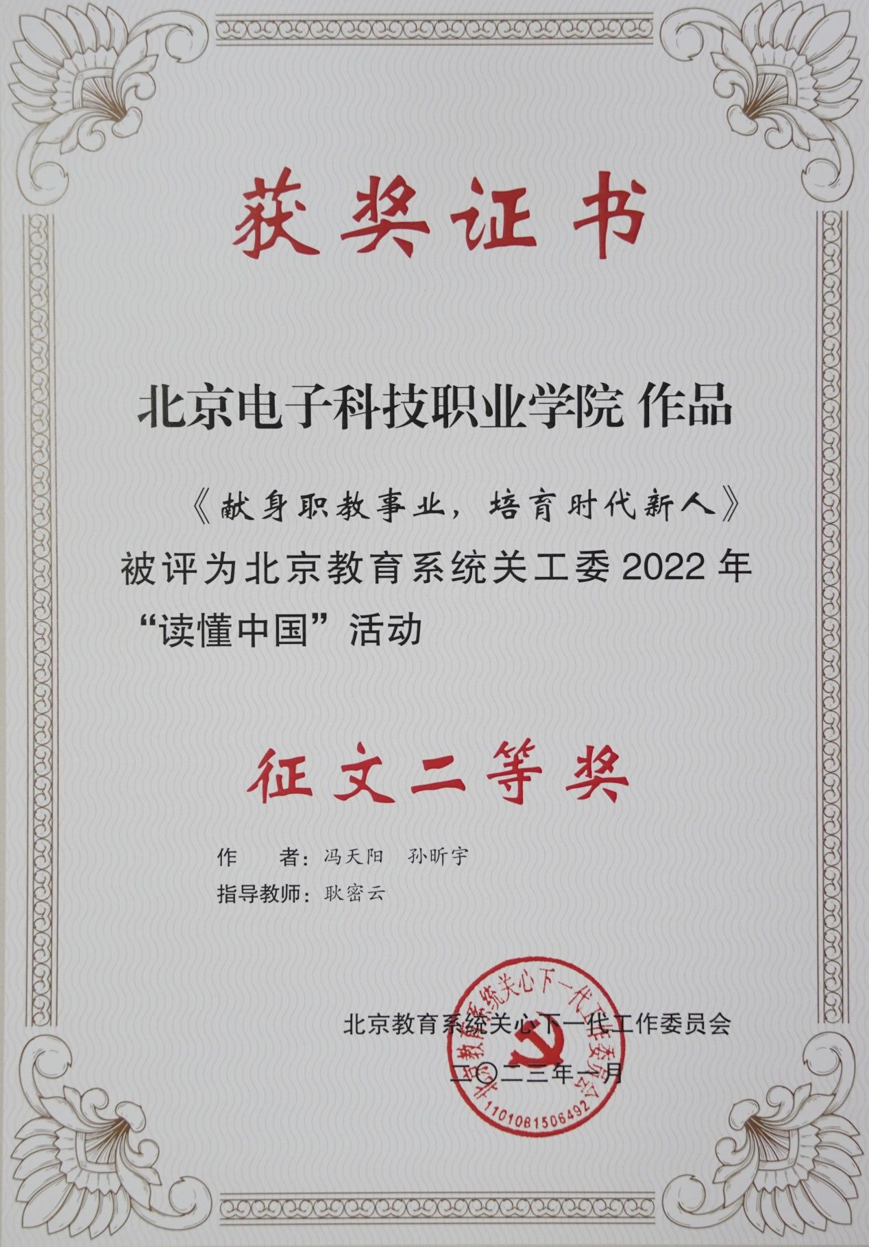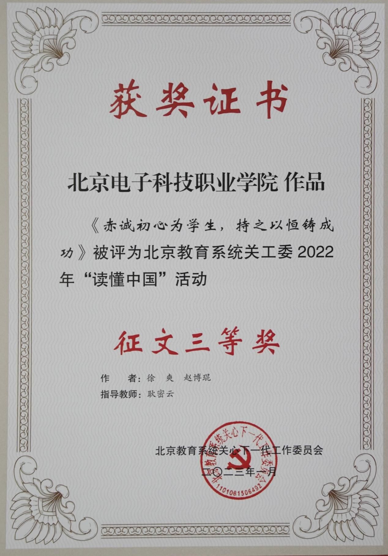 22日至23日,北京教育系统关工委举办学习宣传贯彻党的二十大精神培训班。在培训班总结表彰会上,学校关工委再次受到表彰。微视频“以己之力 报效祖国”分别荣获教育部关工委2022年“读懂中国”最佳微视频和北京教育系统关工委2022年“读懂中国”微视频一等奖。学校关工委受到教育部关工委的表扬并荣获北京教育系统关工委2022年“读懂中国”活动优秀组织奖,贯通学生冯天阳等10人分别荣获北京教育系统关工委2022年“读懂中国”活动征文二等奖和三等奖。学校关工委分别荣获2022年北京高校军训服装捐赠工作先进单位和2022年“新时代好少年”主题教育读书活动先进集体,基础教育学院关工委秘书长李珊珊荣获先进个人。贯通学生刘嘉怡“请党放心,强国有我”演讲视频荣获2022年“新时代好少年”主题教育读书活动演讲类三等奖。