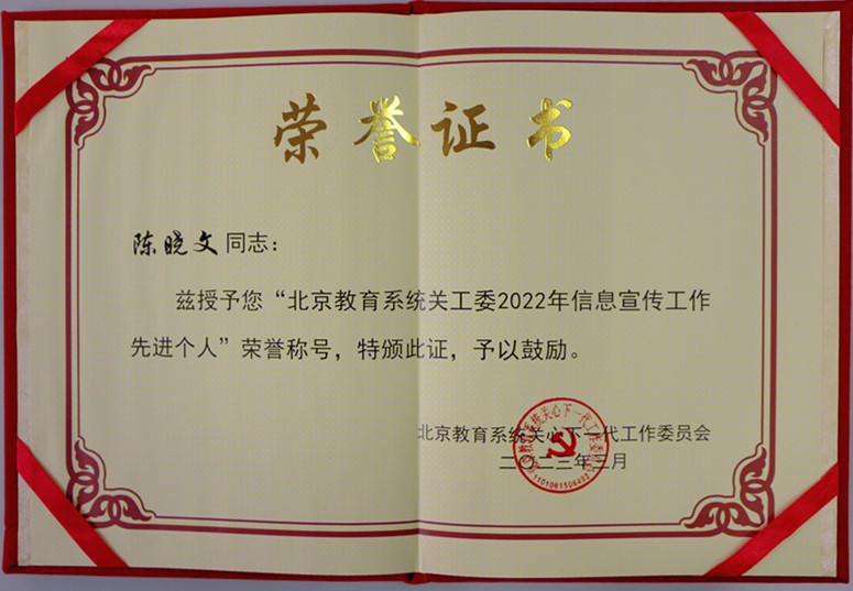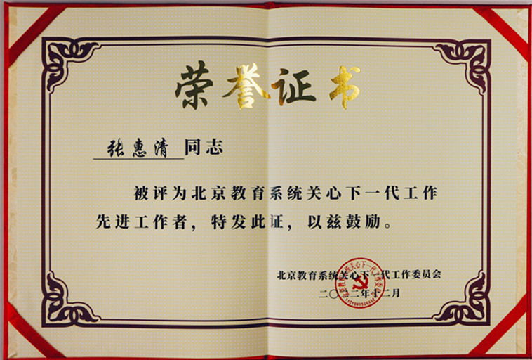 学校关工委、基础教育学院关工委分别荣获“北京教育系统关心下一代工作先进集体”;学校关工委常务副主任王振水、特邀党建组织员张惠清分别荣获“北京教育系统关心下一代工作先进工作者”。学校关工委荣获“北京教育系统关工委2022年信息宣传工作先进单位”,陈晓文荣获“北京教育系统关工委2022年信息宣传工作先进个人”。