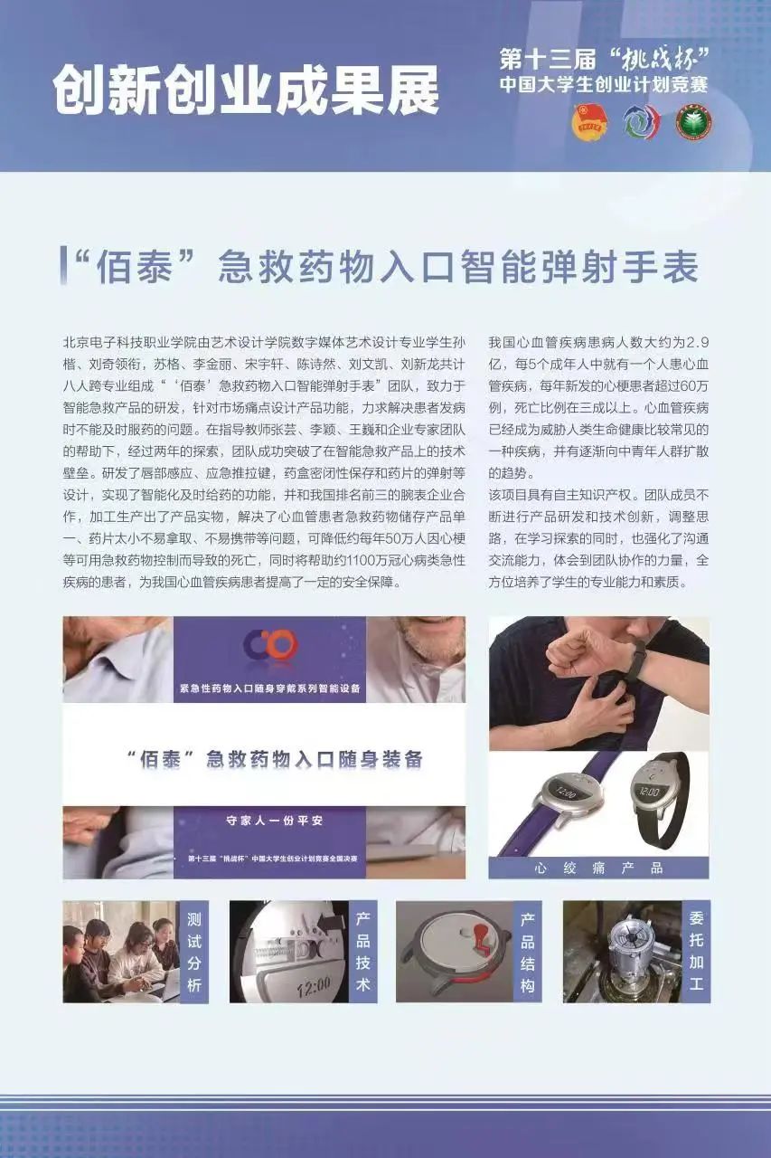 第十三届“挑战杯”中国大学生创业计划竞赛由共青团中央、教育部、人力资源社会保障部、中国科协、全国学联、北京市人民政府主办,北京理工大学、共青团北京市委、北京市房山区人民政府承办。本届赛事共吸引全国3011所学校、142.4万名学生直接参与,申报创新创业项目33万个,共有463个项目晋级全国决赛终审答辩,其中就有BEAT365推报的“倾柯卫足”智能软护甲项目和“佰泰”急救药物入口智能弹射手表项目。