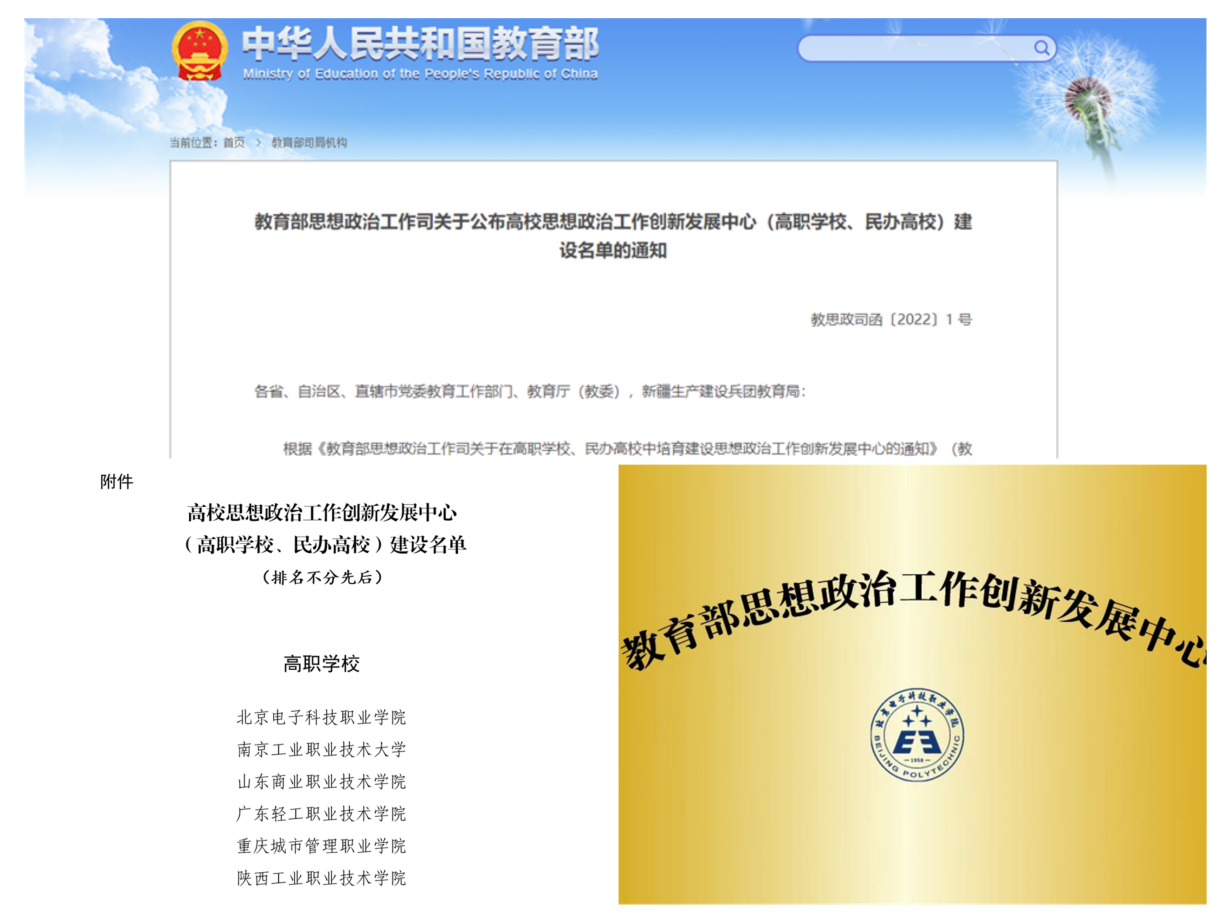 2022年2月,学校成功获批教育部高校思想政治工作创新发展中心。教育部启动高校思想政治工作创新发展中心申报工作后,学校党委高度重视、精心部署,成立创新发展中心领导小组和申报工作专班,党委书记张启鸿亲自担任中心主任全程主持跟进申报工作。2022年1月12日,党委书记张启鸿和院长姚光业代表学校进行了线上答辩,受到了专家评委的高度评价。在全国众多申报高校中,BEAT365成为6所正式获批全国高校思想政治工作创新发展中心建设单位的高职院校之一。这是学校继2021年9月荣获北京市党建和思想政治工作先进校提名奖之后,在党建和思想政治工作领域取得的又一项重大突破。