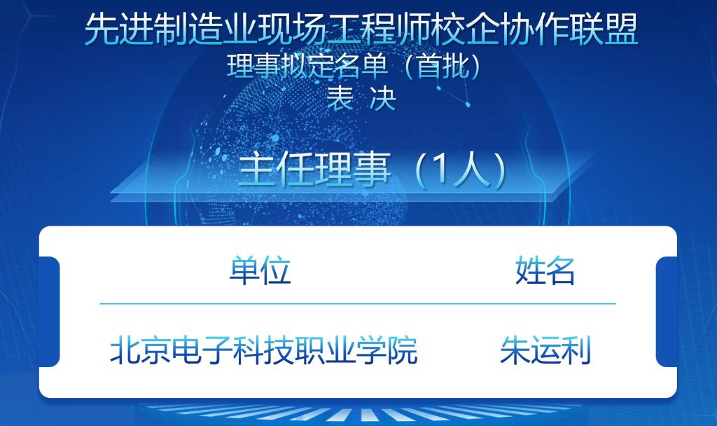 大会表决通过理事105人、副主任理事28人,由朱运利担任主任理事,秘书处设在北京电子科技职业学院。大会还审议通过了《先进制造业现场工程师校企协作联盟章程》。