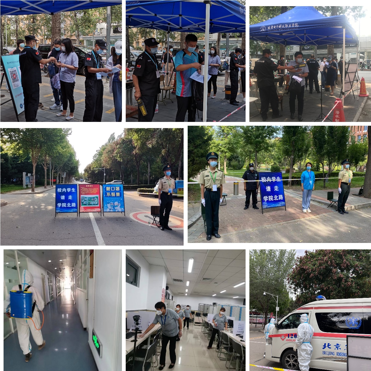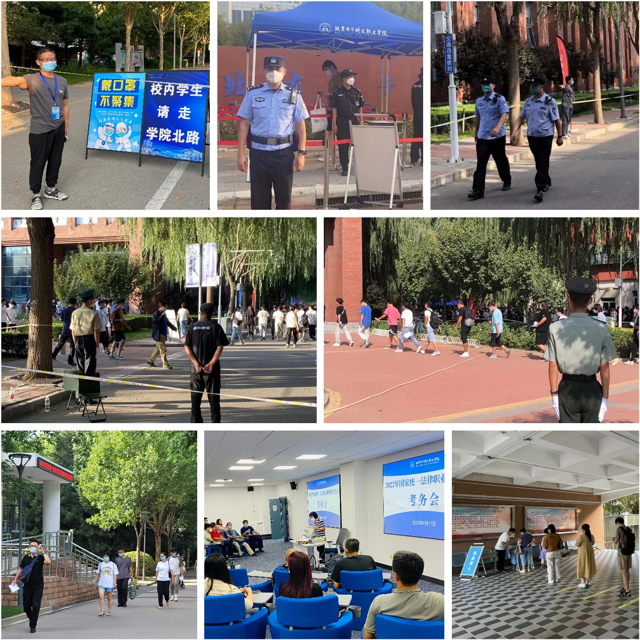 继续教育学院作为本次考试的负责单位,做了大量的准备工作。制作了20块通告牌,提前3天沿途摆放在食堂、宿舍楼等学生必经之路,并通过校内学工系统、教务系统发布通告,告知学生社会考试期间绕行学院北路通行,不进入考试区域。协调保卫处、士官学院增加30名保安和30名士官生与继续教育学院全体工作人员一起在考生和校内学生专用通道沿途执勤站岗,引导校内学生不穿行考试区域、社会考生走专用通道及时到达考场,确保了校内学生和社会考生不交叉、不接触,并按照疫情防控要求及时做好考场消杀工作,确保考生和校内学生健康安全。