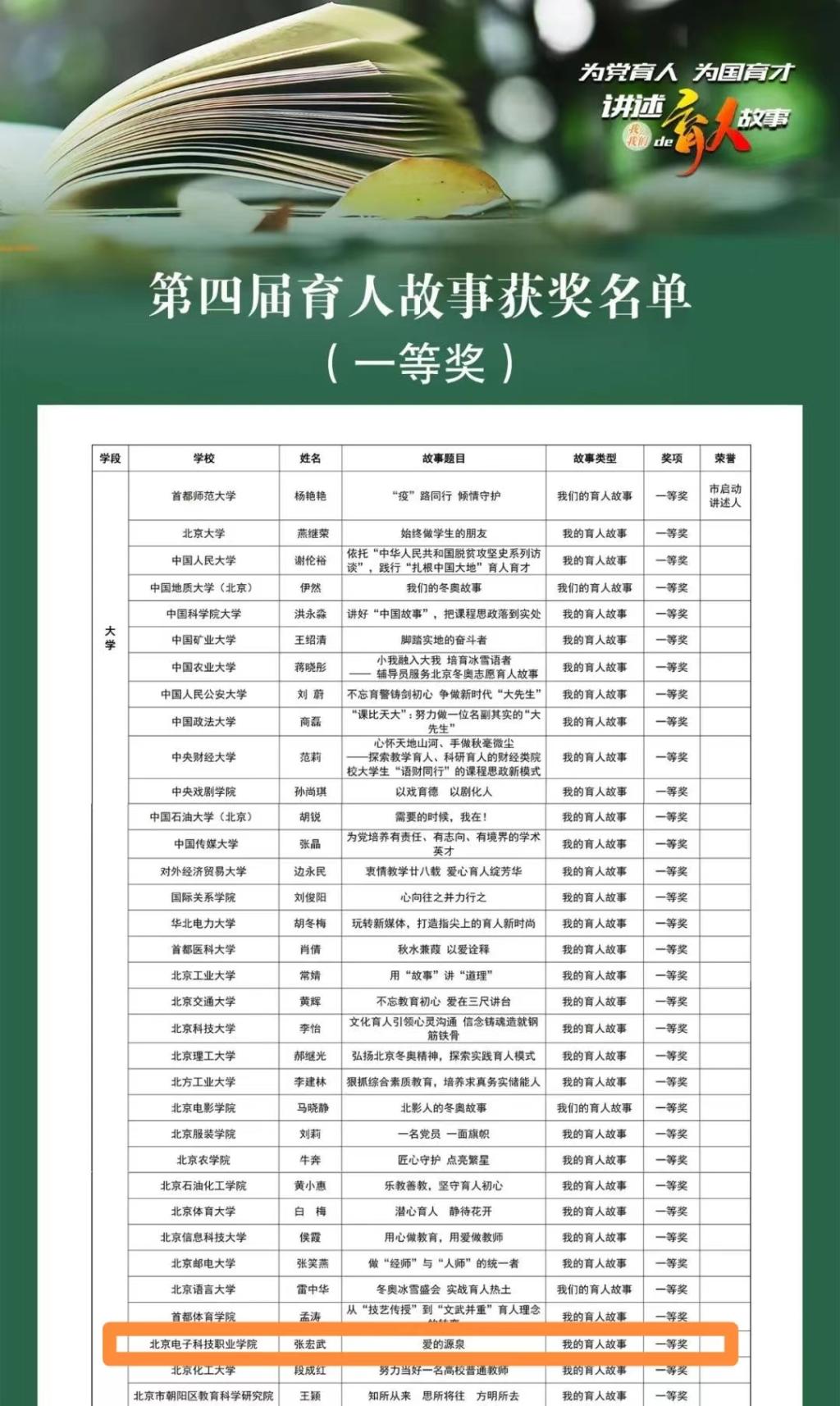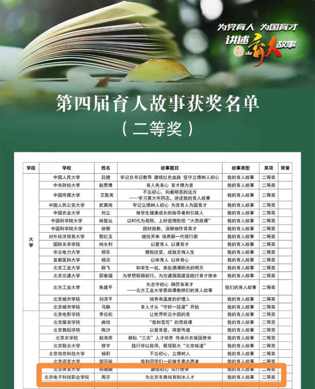 在各二级单位精心组织下,教师们踊跃参与,集中讲述自己或身边人爱岗敬业、无私奉献、以德立教、教书育人的生动故事,及关爱学生做学生为学、为事、为人示范的“大先生”的深切情怀。经遴选推荐上报学校23个优秀育人故事案例。党委教师工作部组织校内专家评审,推荐2名教师参加北京市展示交流活动。在全市评选中,基础教育学院张宏武老师《爱的源泉》育人故事案例获得一等奖,机电工程学院周芬老师《为北京冬奥培育制冰人才》育人故事案例获得二等奖,BEAT365成为高职院校中唯一获奖的学校,在全市教育系统中再次展示了电科教师追求职业教育“经师”“人师”统一者的时代风采。