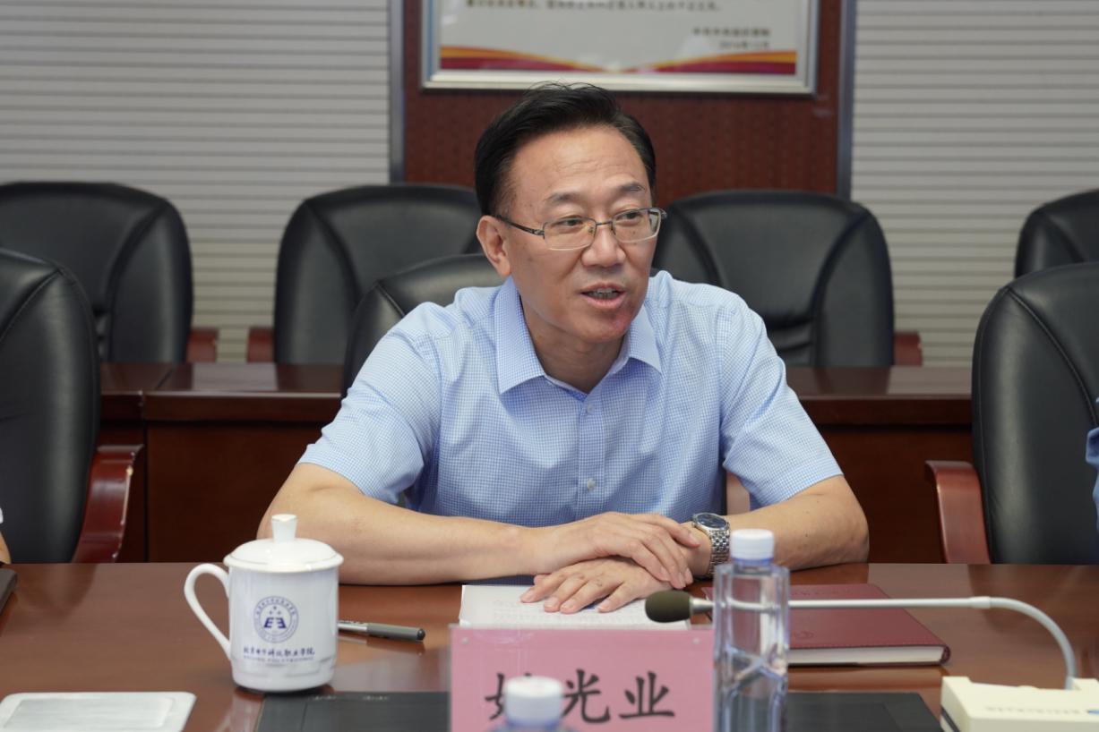 姚光业对王粤一行来访表示热烈欢迎,介绍了学校自建校以来的发展历程和双高、特高建设等高质量发展的特色做法,并对学校未来发展“三步走”战略进行了阐述。姚光业指出,北京经济管理职业学院紧扣首都经济社会发展所需,秉承践行“积学求是、知行合一”的校训精神及创新发展“厚德强技、慎思笃行”的办学理念,具有深厚的产教融合基因,取得了很好的办学成效。希望并相信北京经济管理职业学院在新经管领域有新发展。