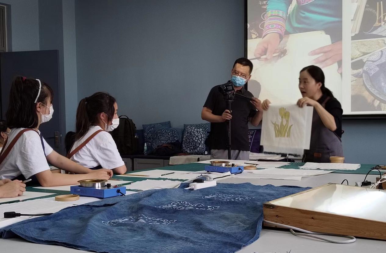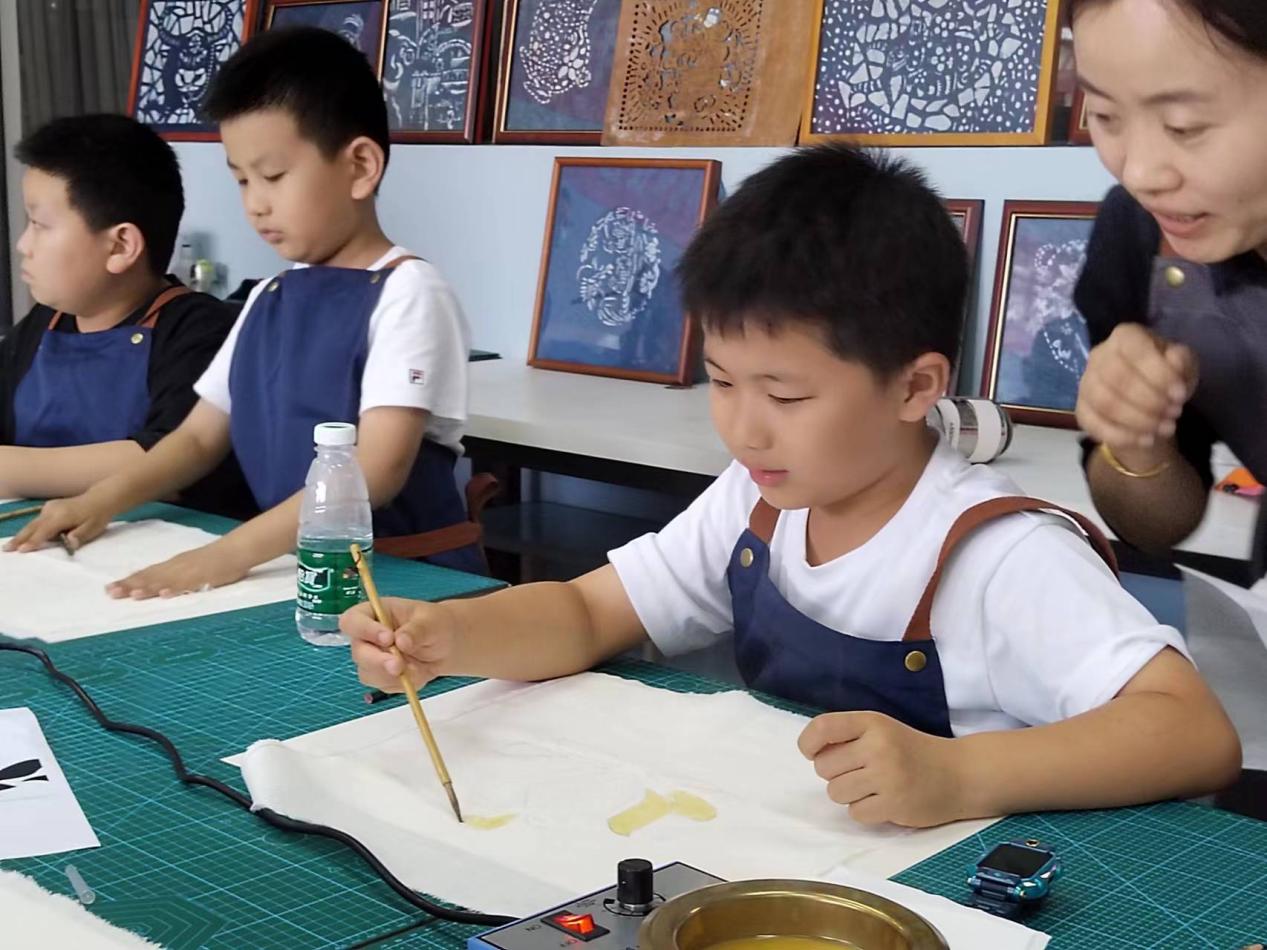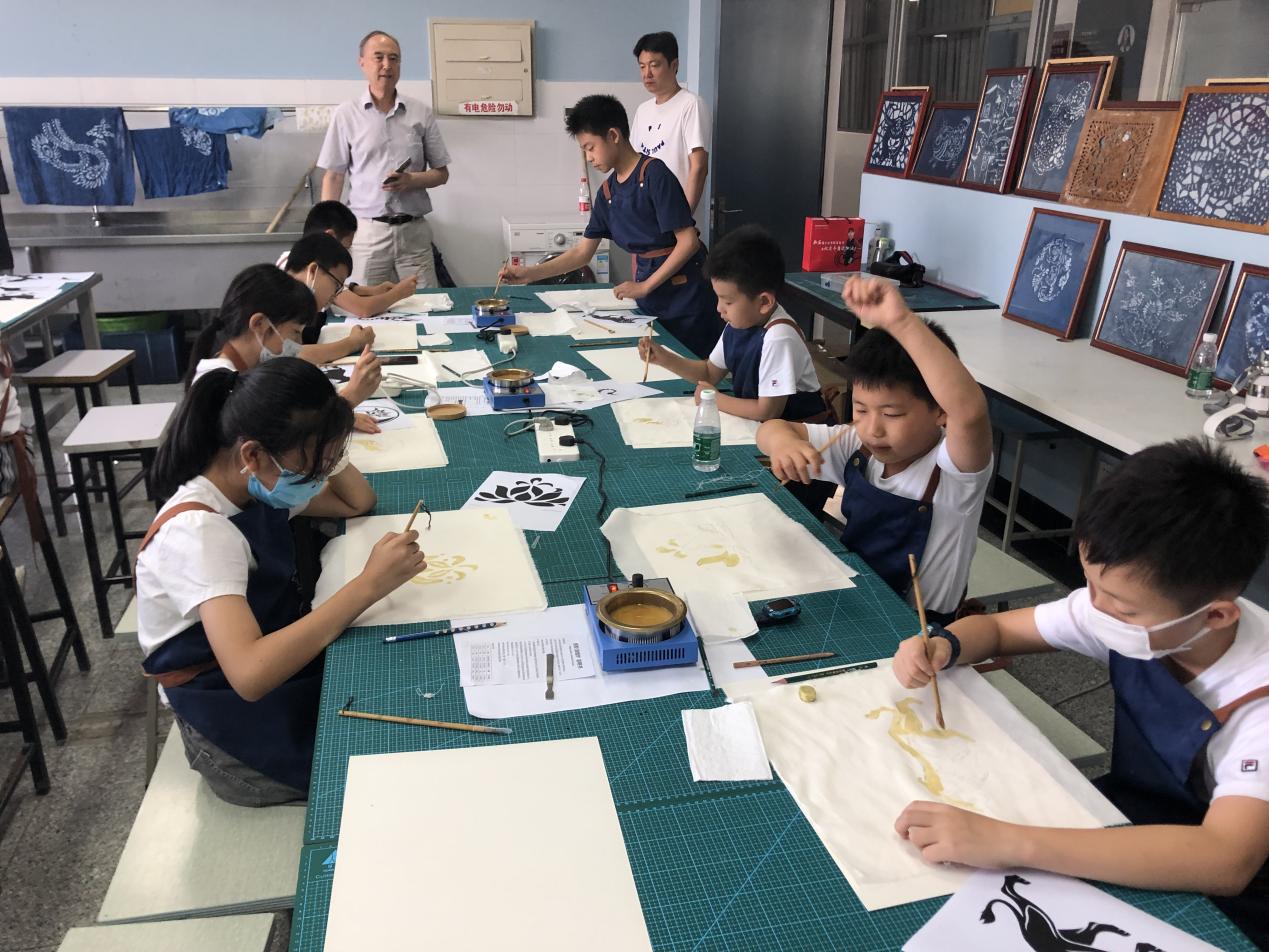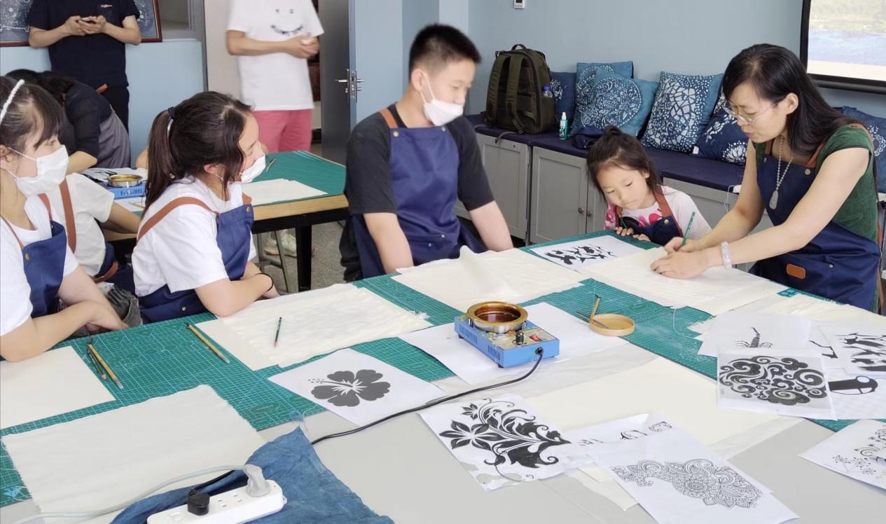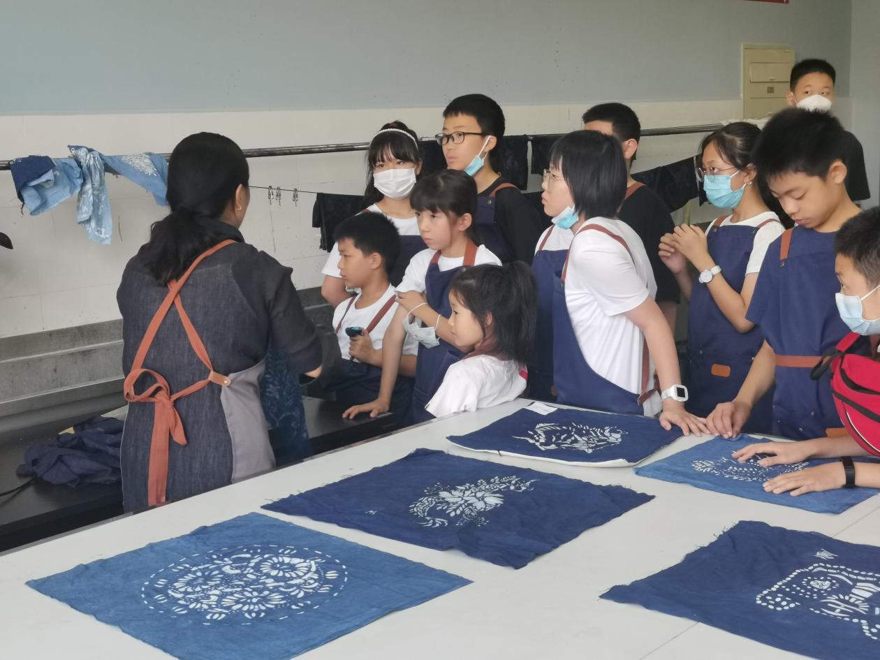 体验非遗项目。7月21日下午,艺术设计学院教师马淑燕和程丽娜为学生们讲解了蓝印印染工艺的起源和发展历史,通过指导学生自己动手,设计制作蓝印印染作品,深入体验基础印染制作过程,让学生们感受到蓝印印染作为我国优秀的民族传统工艺其深厚的文化积淀和美学价值。学生们在小试身手和兴高采烈的过程、氛围中,学习了工匠精神,不断丰富和加深对优秀中国传统文化的认识和热爱,提高了美育素质。