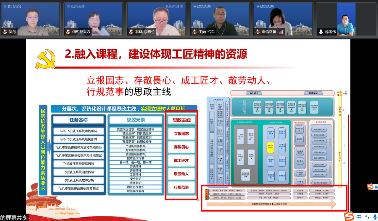 党支部书记们纷纷拿出实招硬招,从“实战”的角度展开交流分享。基础教育学院语文教学部党支部书记李春竹以“以文赋能、培工育匠”为主题,阐述了“坚持党建引领、锚定学部工作,落实课程思政、把稳教育理念,服务专业发展、凝炼团队成长”的工作理念。航空工程学院航空维修系党支部书记刘志军从“支部引领、融入课程、校企合作、文化建设”四个角度,分享了将航空维修作风和民航“三敬畏”精神融入专业课程建设,培养学生的工匠精神的具体案例。汽车工程学院实训中心党支部书记王尚以技能大赛为载体,分享在备赛参赛过程中培育学生“精益求精、专注集中、勇于创新”品质的特色做法。电信工程学院计算机技术系党支部书记马蕾通过开展“强学习、强交流、强活力”的“三强”活动,实现知识传授与价值引领同频共振,切实提高课程思政教学质量。生物工程学院食品技术系党支部书记杨国伟深挖工匠精神内涵,将“匠心匠技匠行匠品匠魂--五匠”思政元素融入人才培养全过程,提升思政育人实效。经济管理学院涉外服务系党支部书记杨明远以学科建设为抓手,创建课程思政“多维融合”教学模式,做到课堂教学与制度建设相统一、相互配合。大家充分交流研讨,为基层党支部开展“课程思政”、培育学生“工匠精神”献计献策、赋能进阶。