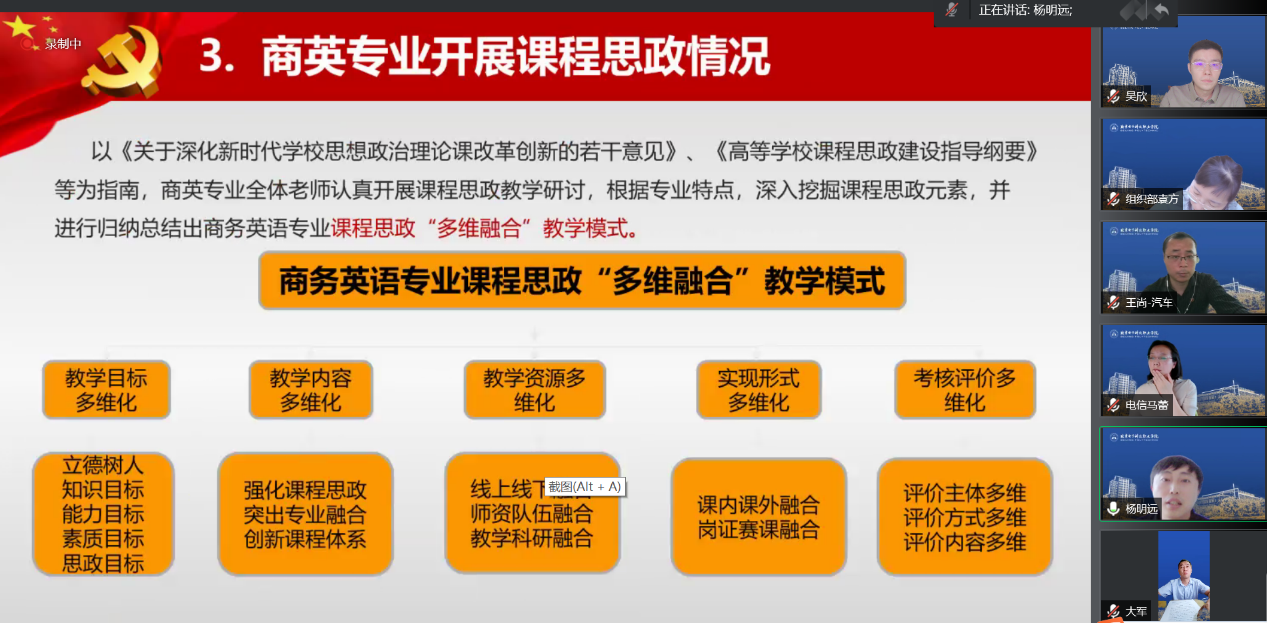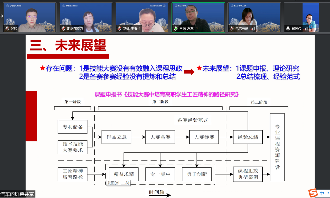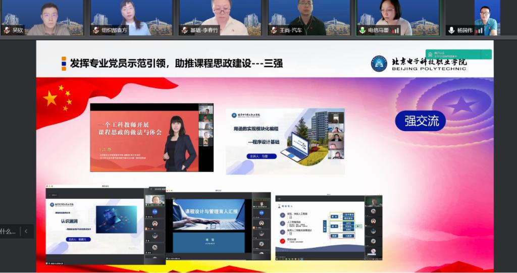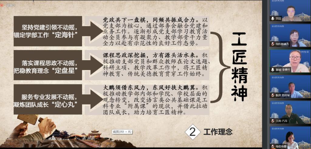 为搭建学校党支部书记交流平台,进一步提升党支部抓“课程思政”、培育学生“工匠精神”的能力水平,找准建强支部建设的出发点落脚点着力点,2022年6月1日下午,学校第二期党支部书记“赋能进阶站”云端开讲,来自不同学院的6名党支部书记线上相聚,围绕基层党支部开展“课程思政”、培育学生“工匠精神”的特色典型做法,交流了工作思路与举措。学校党委组织部、党委宣传部、教务处等相关负责人作为特邀嘉宾参加了研讨。