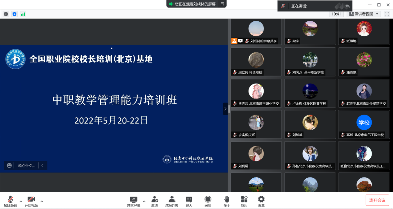 2022年5月20至22日,由北京电子科技职业学院牵头的全国职业院校校长培训(北京)基地(以下简称“基地”)第一期中职教学管理能力培训班顺利完成线上培训任务。来自北京以及全国职业院校的中职主管教学副校长、教务处长、系部主任等128人参加了线上培训。