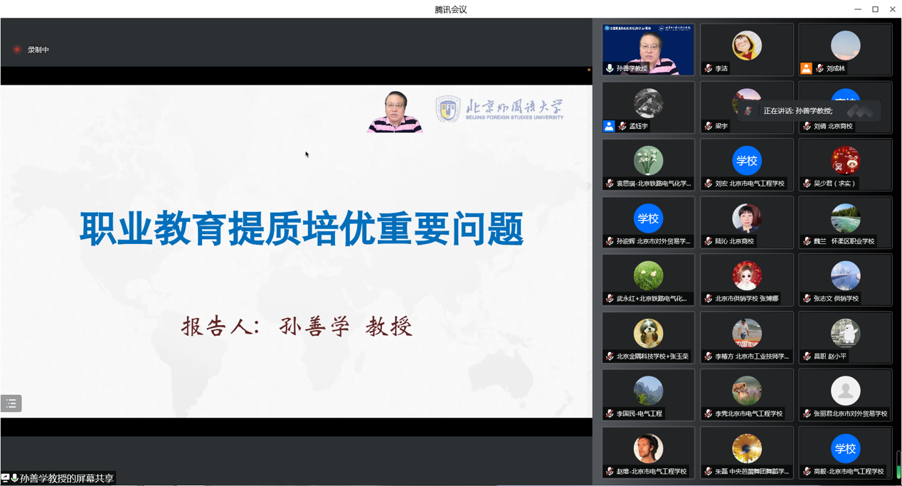 三天的线上培训,6场精彩的专题报告带领学员们系统学习了前沿的理论知识、开拓了教育教学工作思路,得到了参训学员们的一致好评。首场报告是由中国职业技术教育学会副会长、中华职业教育社常务理事、北京外国语大学教授孙善学带来的《职业教育提质培优重要问题》专题报告。报告分别从制度建设、质量建设、功能建设三个方面深入浅出地分析了职教20条热点问题;从职业教育政策解读、数字化赋能问题、岗课赛证综合育人三个方面,对教育大数据应用前景展开剖析,对职业教育提质培优的重要意义进行了深入地解读,为推动提质培优计划的落实,做好各项建设任务,提供了有针对性的指导和辅导。