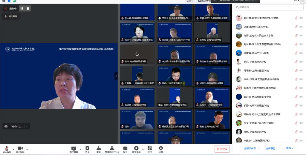 北京电子科技职业学院生物工程学院副院长陈亮主持参训单位团队建设经验分享会。自北京电子科技职业学院、上海市医药学校、上海农林职业技术学院、河北化工医药职业技术学院、黑龙江生物科技职业学院、南京科技职业学院等6所院校团队建设负责人作经验交流,以培促融、以培促建、以培促研,共同推动共同体各成员单位间的融合,推动创新团队的高水平建设,促进课题研究的高质量完成。