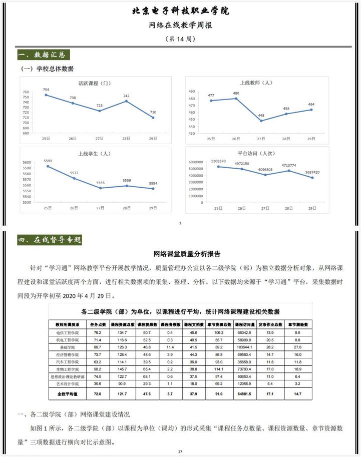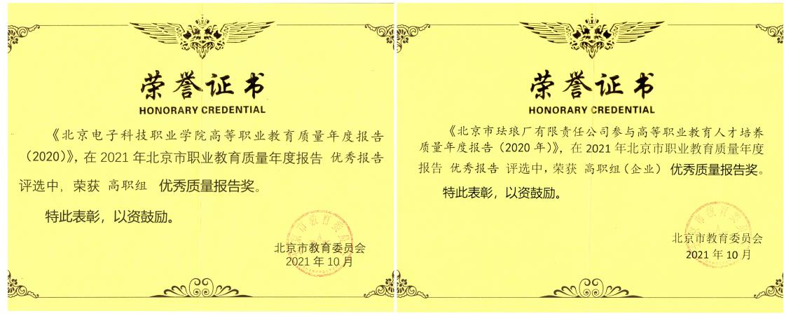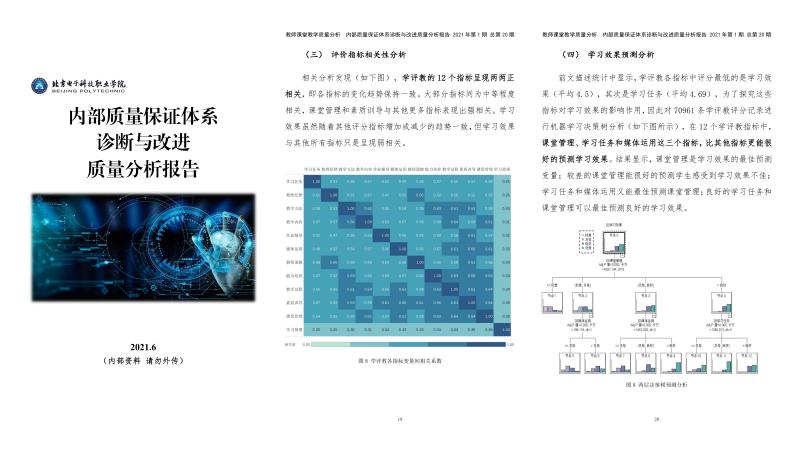 建立数据分析反馈机制,推动内部质量保证体系持续完善。基于大数据技术推进教学诊改工作,加强对教学督导、学评教、状态数据等多维度的统计、比较和分析,建立基于数据分析与反馈的诊改工作机制,充分挖掘学校办学治校各类大数据的潜在价值,定期撰写发布《内部质量保证体系诊断与改进质量分析报告》,为各单位提供数据分析与反馈服务,推动建立常态化诊改机制。编写学校教学诊断与改进报告共24期,有序推进诊改工作,促进形成持续改进的质量螺旋提升,为学校精细化和科学管理提供了参考依据。定期撰写发布学校高等职业教育质量年度报告,从学生发展、教学改革、政策保障、国际合作、服务贡献等方面充分展示学校办学治校水平和人才培养工作成效。2021年学校高职院校质量年度报告荣获北京市教育委员会颁发的高职组优秀质量报告奖和企业优秀质量报告奖。