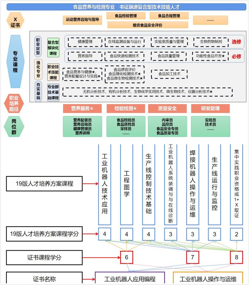 构建书证融通课程体系。把“1+X”证书制度要求有机融入人才培养方案中,建立基于职业技能等级标准的模块化、项目化“书证融通”课程体系。通过单独开设X证书课程、在专业课教学内容中融入X证书内容、在课程考核中融入X证书评价标准等不同形式,积极探索构建多种证书的类型教育模式;通过将X证书培训与取证过程和新版人才培养方案中的小学期进行整体设计,利于X证书考证实施。例如汽车制造与装配技术专业学生可以考取工业机器人应用编程和工业机器人操作与运维2个证书,这两个证书共涉及21个学分的课程,分解到6门专业课程,最后通过集中实践环节组织学生考证集训。