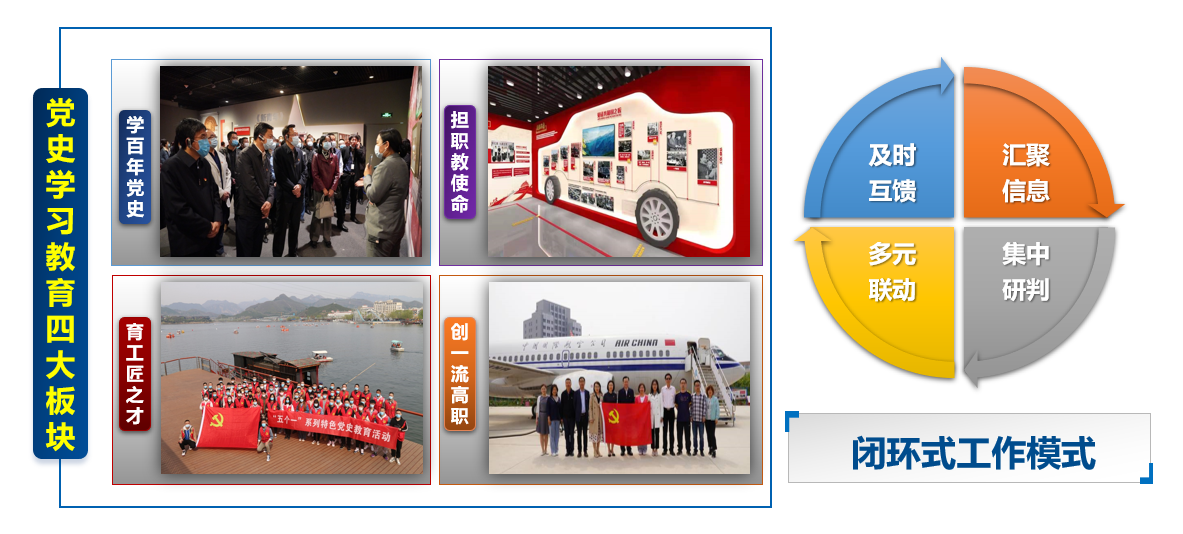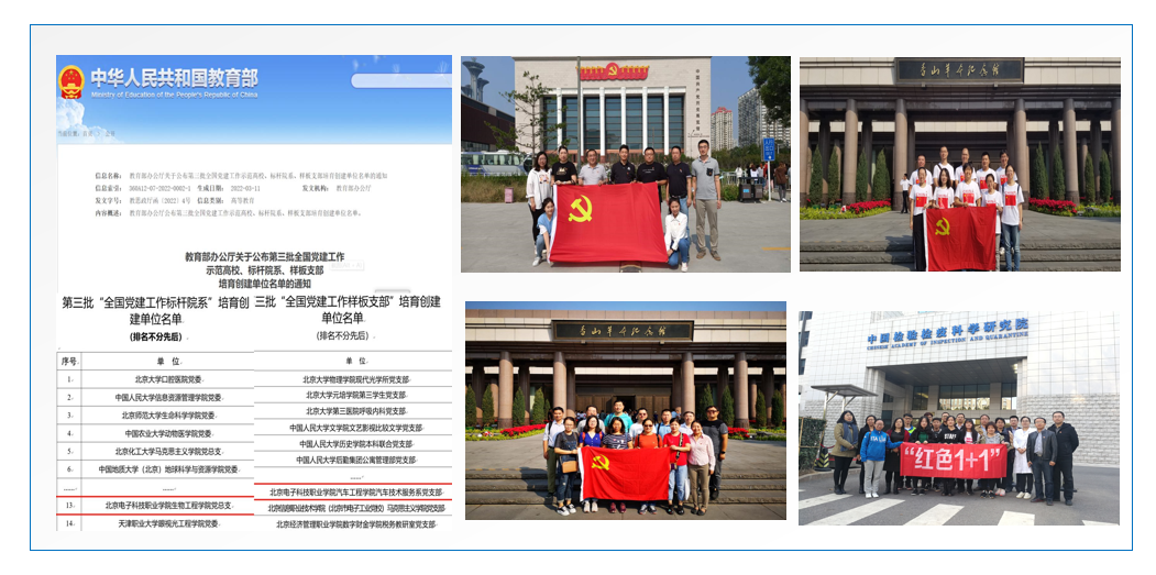 开展党建强基行动。聚焦“末梢循环”,提升基层党建高质量发展,构建了“五个三”基层党建工作体系,抓实班子成员“10个1”党建责任制,开展“三带三改三争”活动,推动“支部双100%”建设,评选了两批“十佳支部工作法”,打造了“六带头、双促进”等70余个特色党建品牌,推动支部在“特高”“双高”等重大任务中“挑大梁”,引导党员在职教改革创新中“扛大旗”。聚焦“职教特色”,以“近邻党建”为抓手,发挥党建在区校企深度融合中的“红色引擎”作用,共建开发区党校教学基地,服务区内企事业单位党员教育培训,40余个校企党支部结对共建,探索形成“商约—签约—履约—评约”支部共建“四步走”模式,在共建AMECO航空工程技术学院、百度智能网联汽车产业学院、“冬奥双冰场馆制冰班”中带领师生党员攻坚克难,奋战在开发区企业疫苗生产及检测岗位,形成了服务国家冬奥会与抗击疫情的典范。聚焦“全局视野”,打造了连点带线成面的“一带四区六品牌”党建引领事业发展新版图,发挥全国党建工作“标杆院系”“样板支部”示范引领效能,形成基层党组织“合格-先进-标杆(样板)”递进式提升链条。近三年,获评教育部全国“标杆学院”建设单位1个,是北京市唯一入选的高职院校院系党组织,“全国样板支部”建设单位2个,“全国双带头人教师党支部书记工作室”建设单位1个,在全市红色1+1支部共建评选中获得二等奖两项。