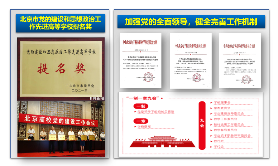 开展政治统领行动。学校党委始终坚持把党的政治建设摆在首位,精心制定加强党的政治建设20项措施及181条任务清单,以钉钉子精神持之以恒抓好党的政治建设。坚持和完善党委领导下的校长负责制,健全党委领导班子务虚研讨、党委全委会和常委会研究决策、校长办公会推进落实、党建工作会和二级党政联席会部署督促问效的“全链式”议事决策体系。建设勤学习善思考的学习型、善团结讲民主的和谐型、善谋划勇改革的创新型、爱师生重实干的务实型领导班子,班子连续3年考核名列北京教育系统前茅。坚持将党的领导融入学校治理体系和治理能力现代化建设,构建了“一制一章九会”治理框架和运行机制。2021年,BEAT365成功获得“北京市党建与思想政治工作先进普通高等学校提名奖”,是获得提名奖表彰的5所高校之一,同时BEAT365“坚持产城教融合发展,打造高等职业教育人才培养新模式”项目获得第一批北京高校党建和思想政治工作特色项目。此次获奖是BEAT365首次在党建先进校评选中获奖,也是北京高职院校首次获得该奖项,是学校事业发展中的又一项重大突破。