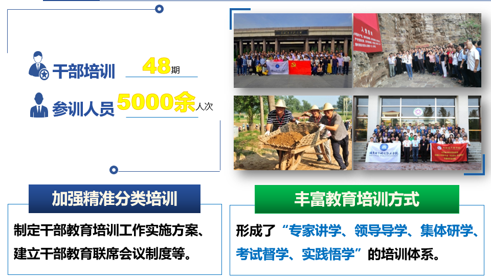 开展干部培育行动。坚持突出政治标准,制定了政治素质考察的实施细则,建立了处级干部的政治档案和干部廉政档案。严格选任程序,建立健全了处级干部选拔任用、考察、试用期满考核等一系列实施办法。坚持日常监督管理,制定了处级干部谈话制度、离京备案规定、因私出国(境)管理办法、兼职管理办法等制度。2018-2021年处级干部个人事项查核如实率连续4年均为100%。激励干部担当作为,开展了校内干部挂职锻炼,成立了“匠心”青年人才领航工作站,促进了青年人才更快更好成长。加强精准分类培训,制定干部教育培训工作实施方案、党员教育培训规划,建立干部教育联席会议制度。三年来开展干部培训共计48期,参训人员近5000余人次。丰富教育培训方式,开展党的重大理论轮训班、读书班、专题培训班,赴井冈山、红旗渠干部学院等开展培训,逐步形成了“专家讲学、领导导学、集体研学、考试督学、实践悟学”的培训体系。