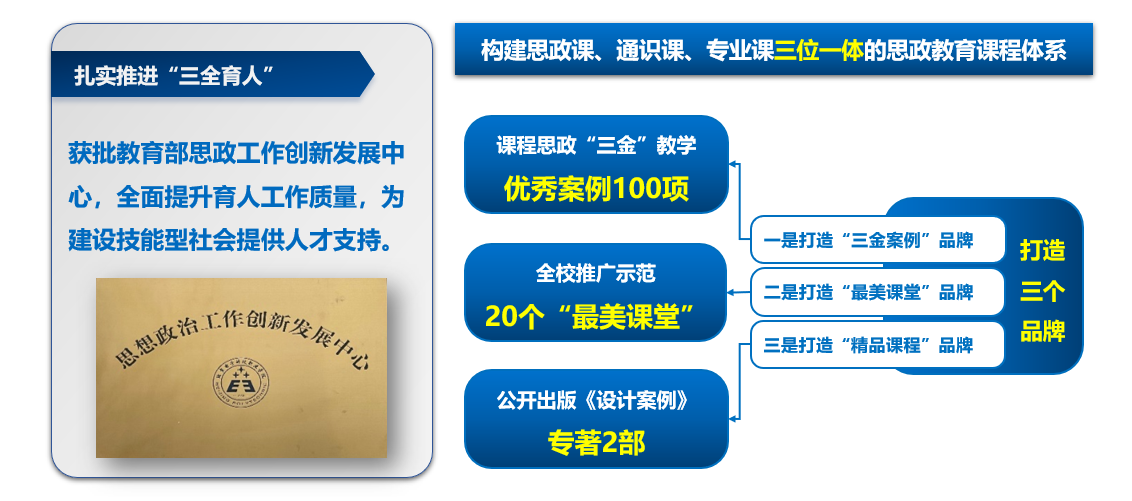 开展思想领航行动。学校党委深入学习贯彻中央和市委重大决策部署,扎实开展“不忘初心、牢记使命”主题教育和党史学习教育,引导基层党组织把理论学习同学校“提质培优、增值赋能、建高升本”工作结合起来,形成了“五学”教育模式 ,建立了“六个一”调研机制,中央和市委指导组入校督查,给予充分肯定。及时修订意识形态工作责任制实施细则,构建“汇聚信息、集中研判、多方联动、及时互馈”闭环式工作模式。全面加强师生思想政治工作,系统推进“三全育人”“五育并举”综合改革,构建“六位一体”工匠精神培育体系。2022年,学校获批教育部高校思想政治工作创新发展中心,为获批6所全国高职院校其中之一。近年来,学校荣获第四届首都大学生思想政治教育工作实效奖、首都大学生心理健康教育“特色活动奖”、首都资助育人典型经验单位,连续两届被评为“首都文明校园”,获评北京市市级部门首批新时代文明实践基地,获评全国高职教育改革发展“三全育人优秀成果案例”20强,入选首届全国学校国防教育典型案例30强。大力推动“思政课程”与“课程思政”协同育人,遴选150个“三金”课程思政优秀教学案例,获批国家社科基金高校思政课研究专项课题1项,获得北京市第十一届思想政治理论课教学基本功比赛一等奖1项,2门课程获评国家级课程思政示范课程、教学名师和团队,3门课程获批北京市级课程思政示范课程、教学名师和团队。