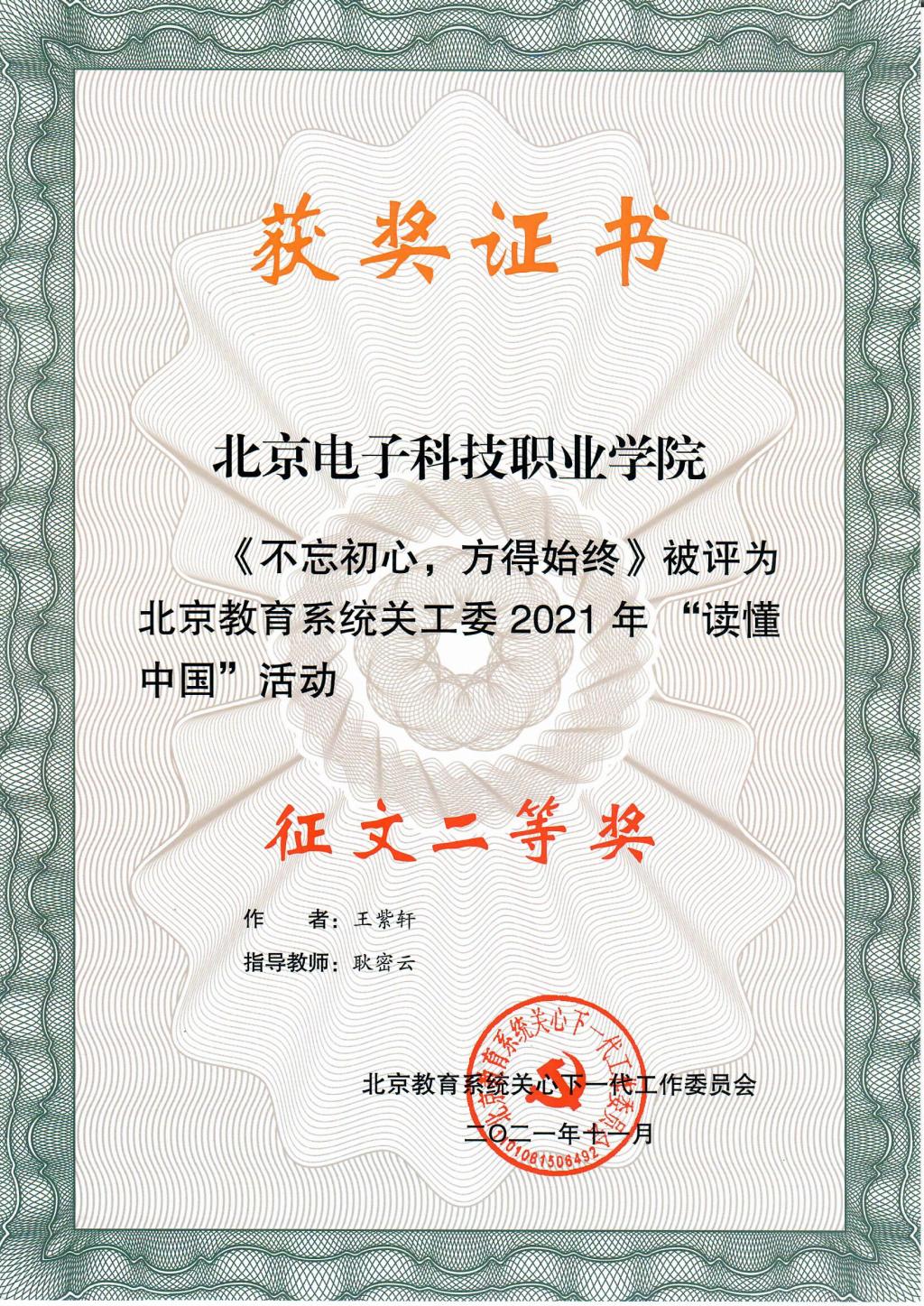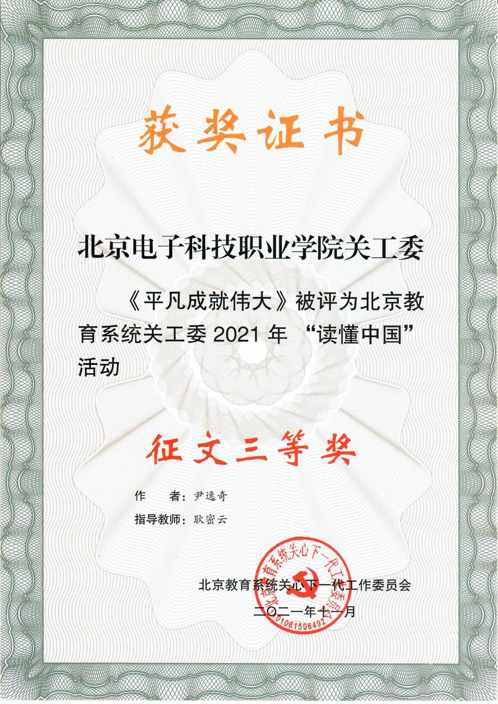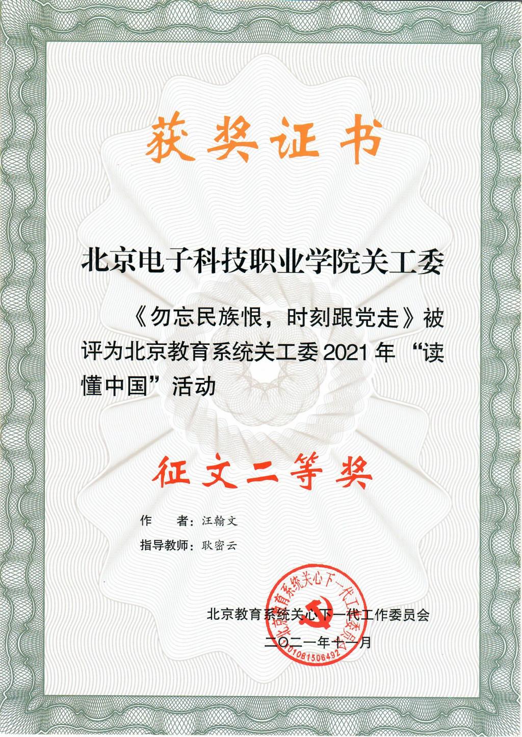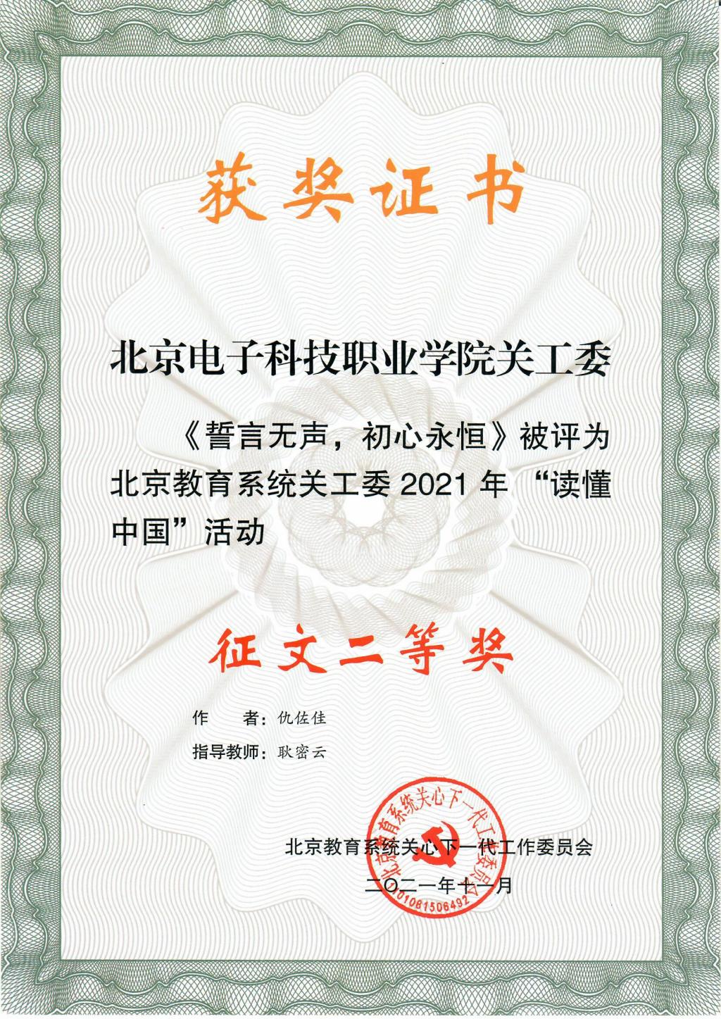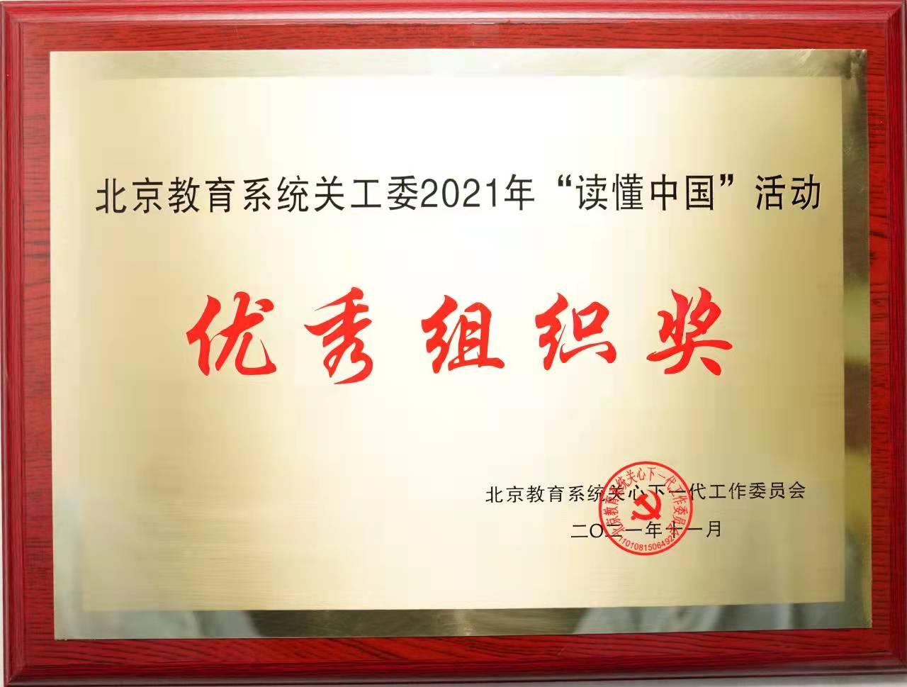 学校关工委在荣获教育部先进集体的基础上,又荣获北京教育系统关工委2021年信息宣传工作先进单位、北京教育系统关工委2021年“新时代好少年”主题教育读书活动先进集体、北京教育系统关工委2021年“读懂中国”优秀组织奖。《薪火相传 初心永恒》微视频荣获北京教育系统关工委2021年“读懂中国”微视频一等奖、高职学生朱星武《民族仇恨铸国魂 坚守初心为人民》等五篇征文分获北京教育系统关工委2021年“读懂中国”主题征文一等奖1个,二等奖3个,三等奖1个。离退休工作处处长、党委组织部副部长、关工委秘书长陈晓文荣获北京教育系统关工委2021年信息宣传工作先进个人荣誉称号。