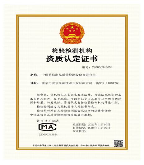 2021年12月4日至5日,北京电子科技职业学院、国家保护消费者基金会打假工作委员会、中保益信商品质量检测有限公司三方合作共建的食品质量检测实验室(简称“食品质量检测实验室”),通过了中国计量认证(China Inspection Body and Laboratory Mandatory Approval,CMA)现场评审,取得检验检测机构资质认定证书(CMA)。