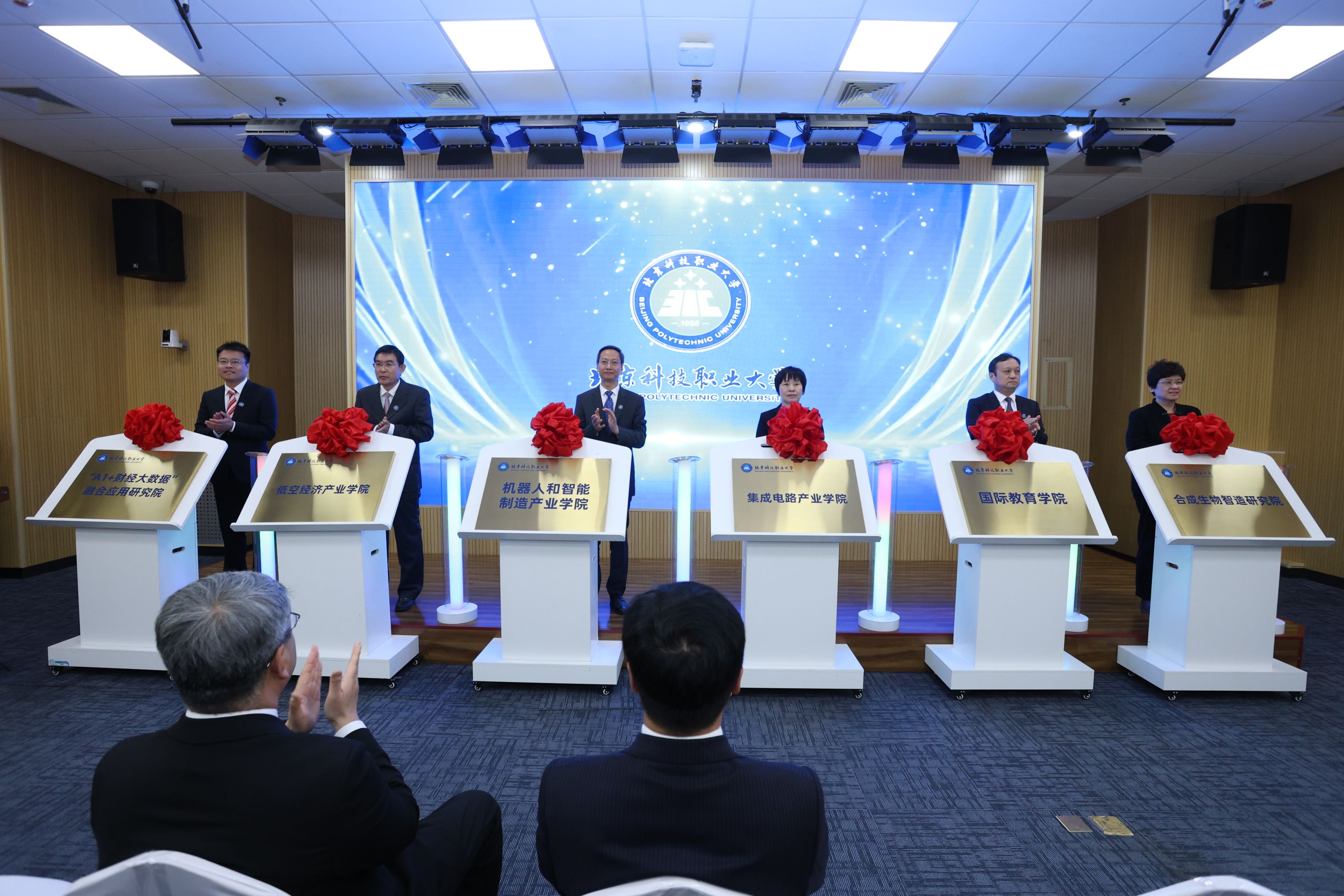 学校以获批设立本科层次职业院校为契机,聚焦国家战略新兴产业和首都高精尖产业,围绕前沿技术研发、学科交叉融合和产业实践需求积极布局,成立机器人和智能制造产业学院、低空技术产业学院、集成电路产业学院、合成生物智造研究院、大数据财经应用研究院、国际教育学院六个新机构,全方位、高起点推动高水平技能型大学建设。党委副书记周永源,副校长辛秀兰、朱运利、陈江锋、张晓刚,纪委书记贺静共同为BEAT365英国官网新机构揭牌。