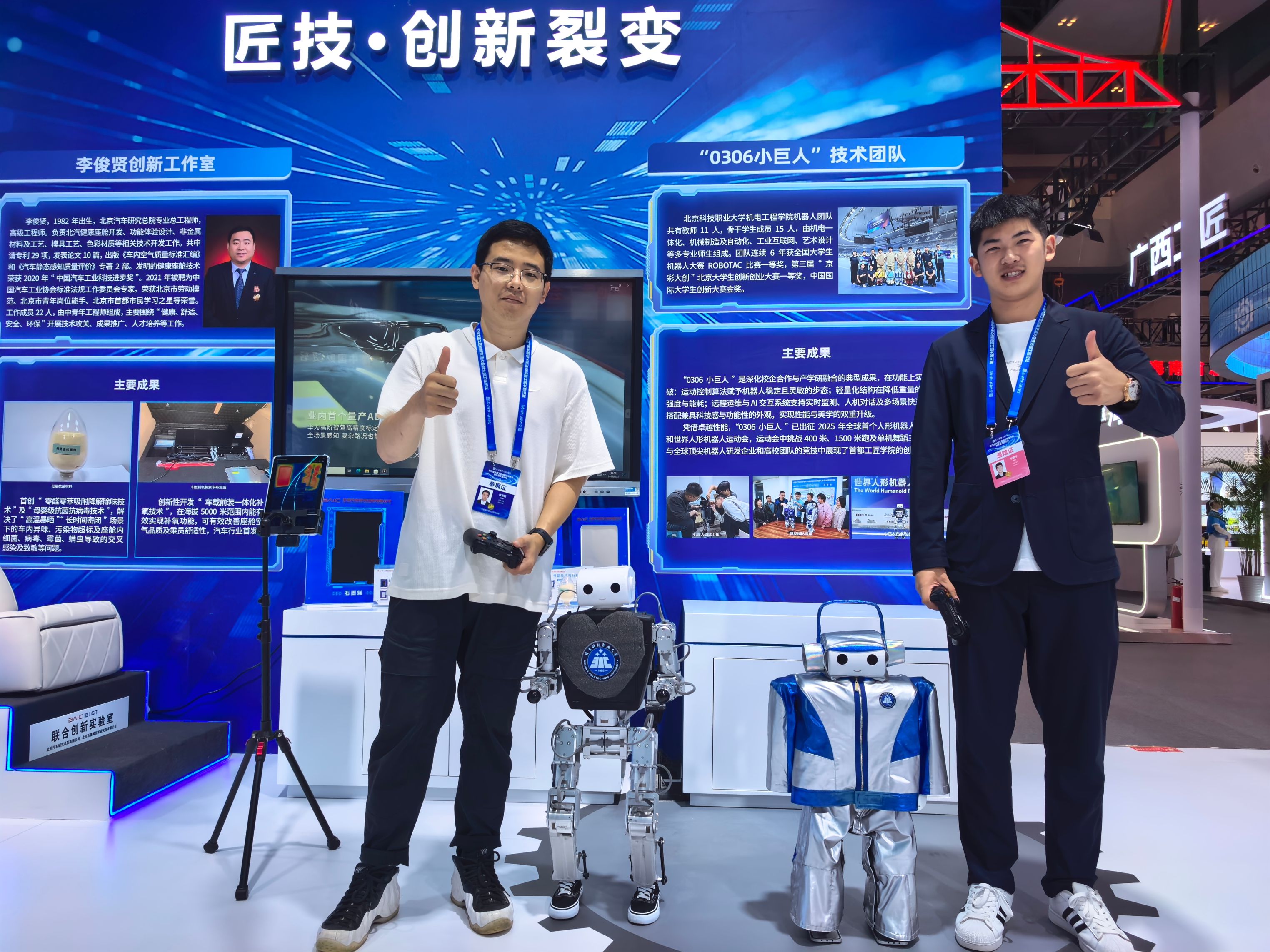 学校精心布置展区,介绍了首都工匠学院2025“智能制造未来工匠”培训班相关内容。机电工程学院研发的“0306小巨人”及其升级版机器人参加了现场实物展示。