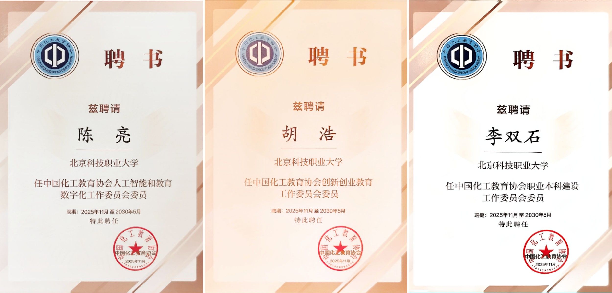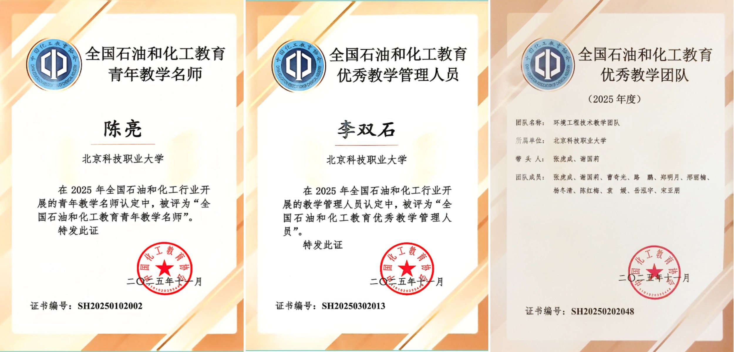 本次年会对2025年全国石油和化工教育先进典型予以表彰,生物工程学院荣获多项荣誉,陈亮获评“全国石油和化工教育青年教学名师”,李双石获评“全国石油和化工教育优秀教学管理人员”,环境工程技术学团队获评“全国石油和化工教育优秀教学团队”。生物工程学院教师在中国化工教育协会分支机构中担任重要职务,陈亮受聘为人工智能和教育数字化工作委员会委员,李双石受聘为职业本科建设工作委员会委员,胡浩受聘为创新创业教育工作委员会委员。