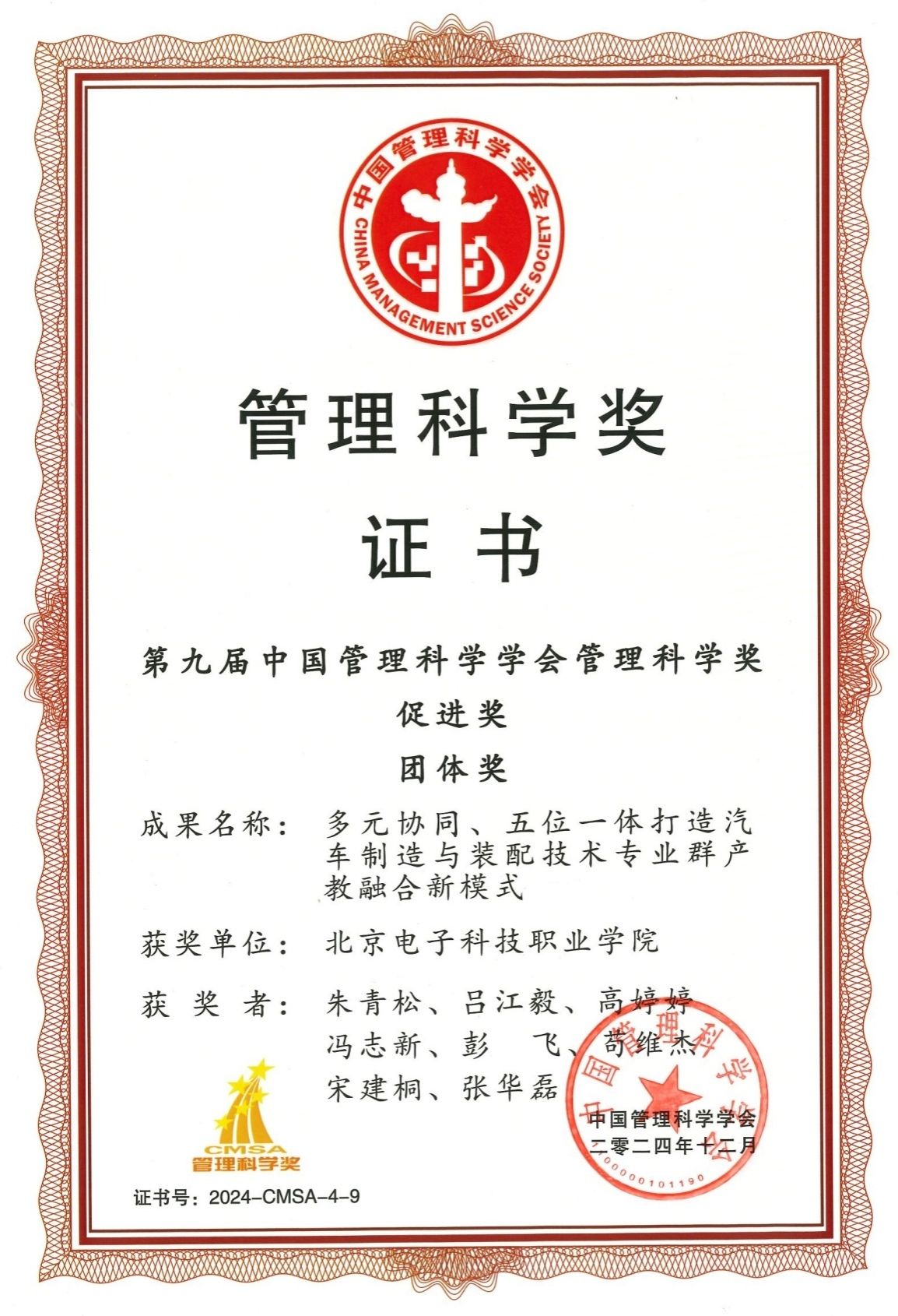近日,2024中国管理科学大会暨第九届管理科学奖颁奖典礼在北京长富宫饭店圆满闭幕。大会表彰了第九届中国管理科学奖的获奖单位和个人。第九届中国管理科学奖评选出获奖成果70项,其中“管理科学奖”促进奖(团体)10项。汽车工程学院朱青松团队报送的“多元协同、五位一体打造汽车制造与装配技术专业群产教融合新模式”荣获“管理科学奖”促进奖(团体)。