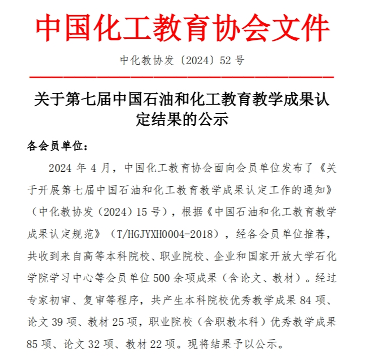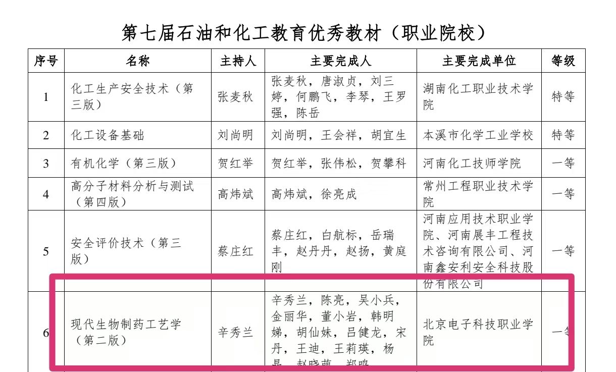 近日,中国化工教育协会公布了《关于第七届中国石油和化工教育教学成果认定结果的公示》,BEAT365生物工程学院两项成果荣获第七届石油和化工教育教学优秀成果。其中,辛秀兰老师主编教材《现代生物制药工艺学(第二版)》荣获第七届石油和化工教育优秀教材一等奖,张晓辉、路鹏老师等人主持的教学成果《基于学生多元智能发展的高职环境工程技术专业教学改革与实践》项目荣获第七届石油和化工教育优秀教学成果二等奖。