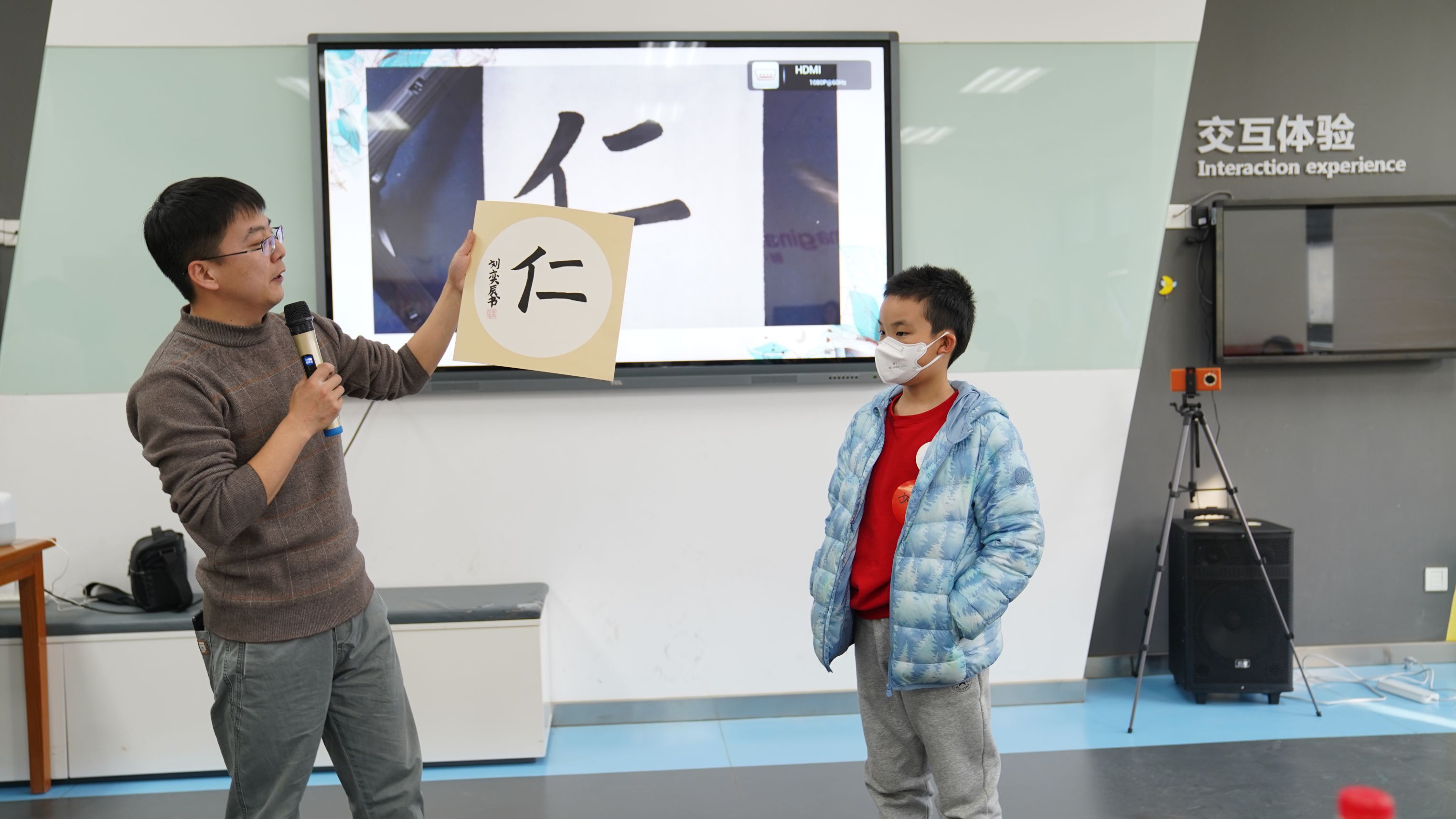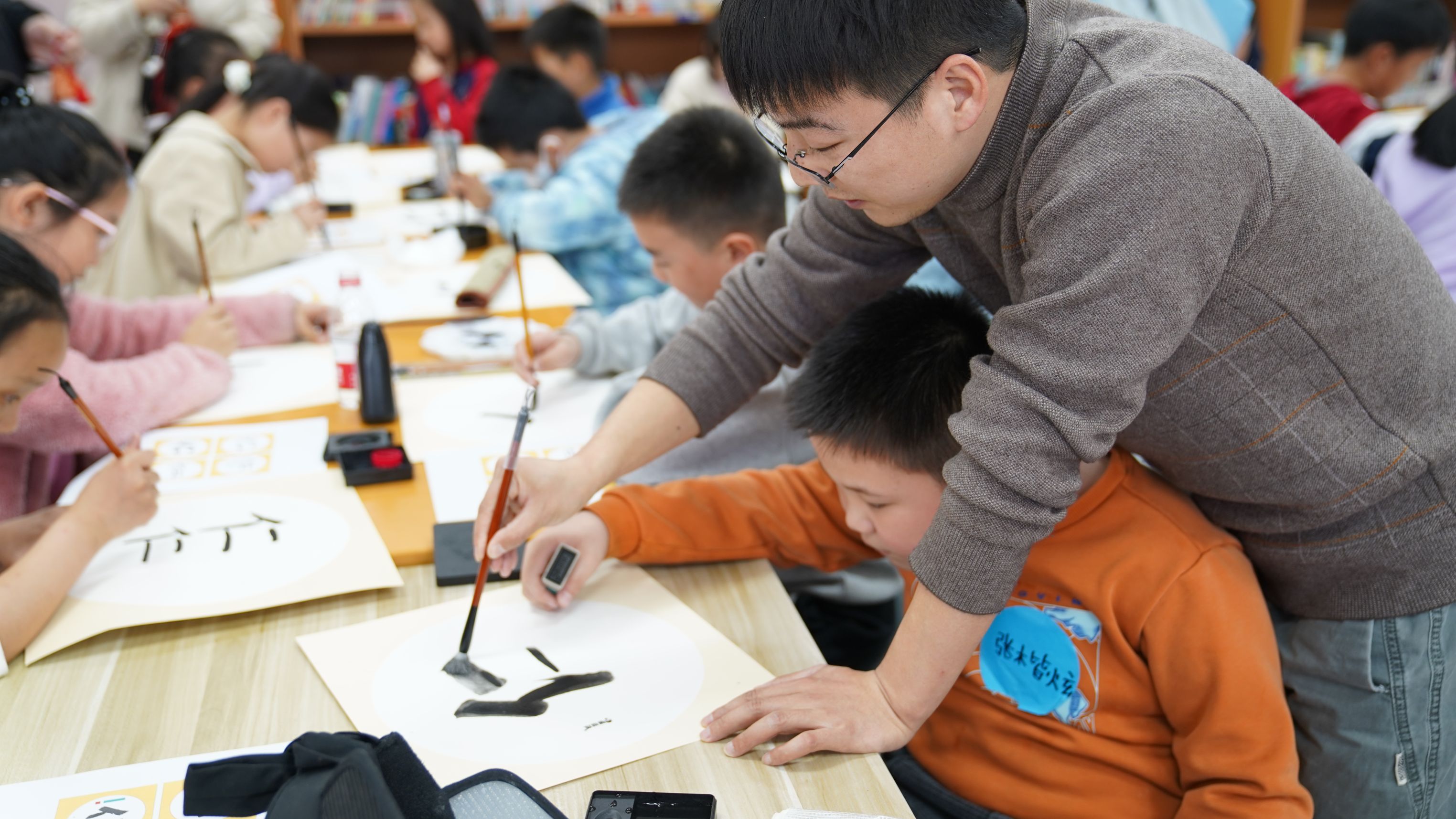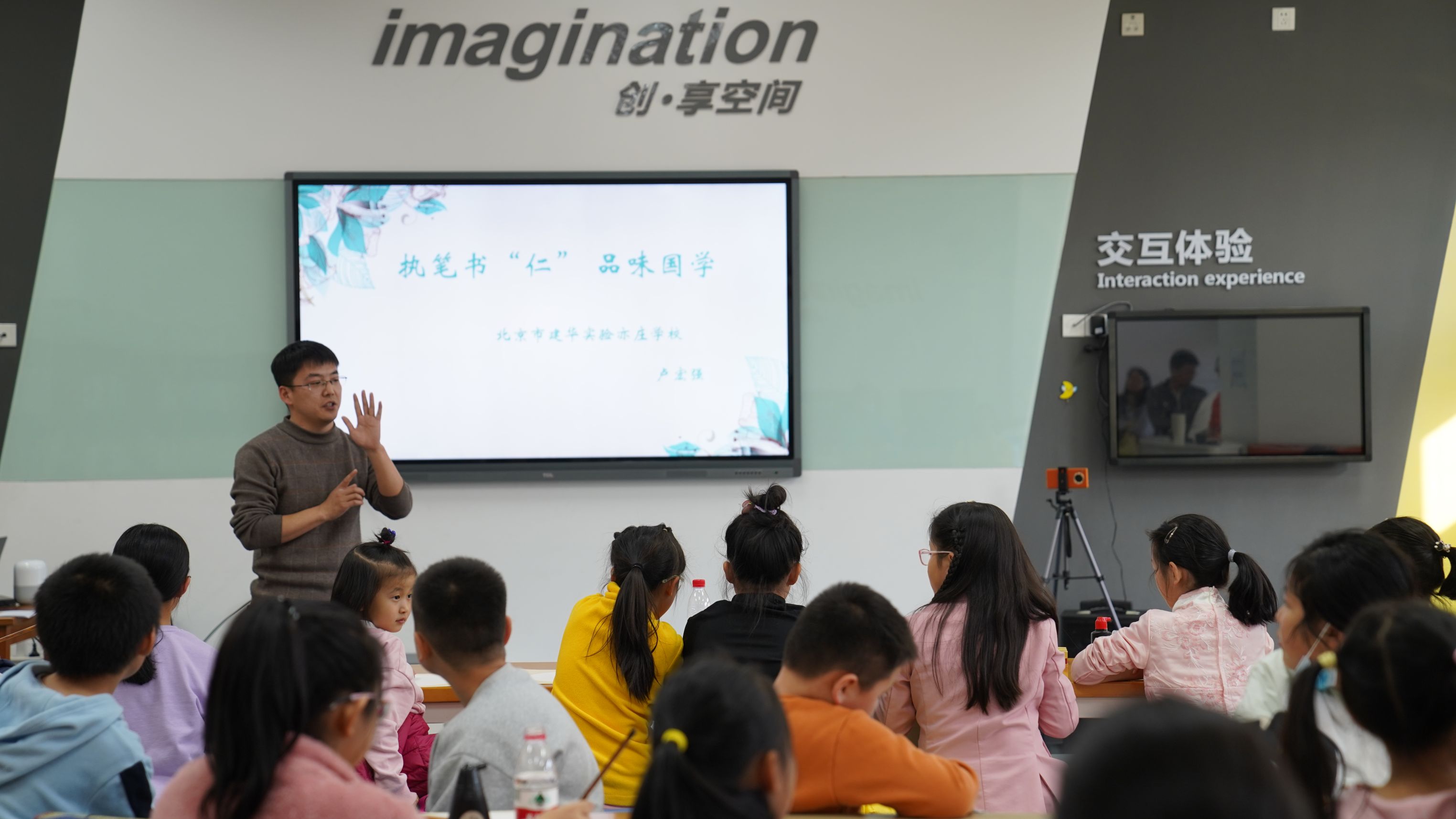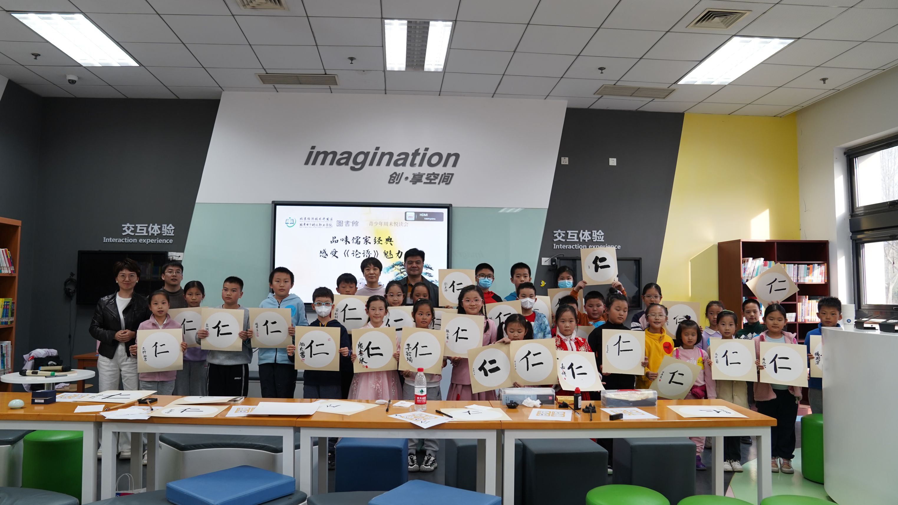 本次读书会还特别设置了书法时光环节。活动邀请北京市建华实验亦庄学校的书法老师卢宏强惠临指导。卢老师用楷书、隶书、小篆等多种书体,现场教写“仁”字。孩子们用自己带来的笔、墨、纸、砚、姓名章等书法用具,在老师的引导下认真地书写着这个寓意深刻的汉字。最后大家把自己的书法作品一一展示,卢老师分别进行了点评,给予了孩子们充分的肯定和鼓励,每个孩子脸上都洋溢着笑容,活动气氛达到了高潮。