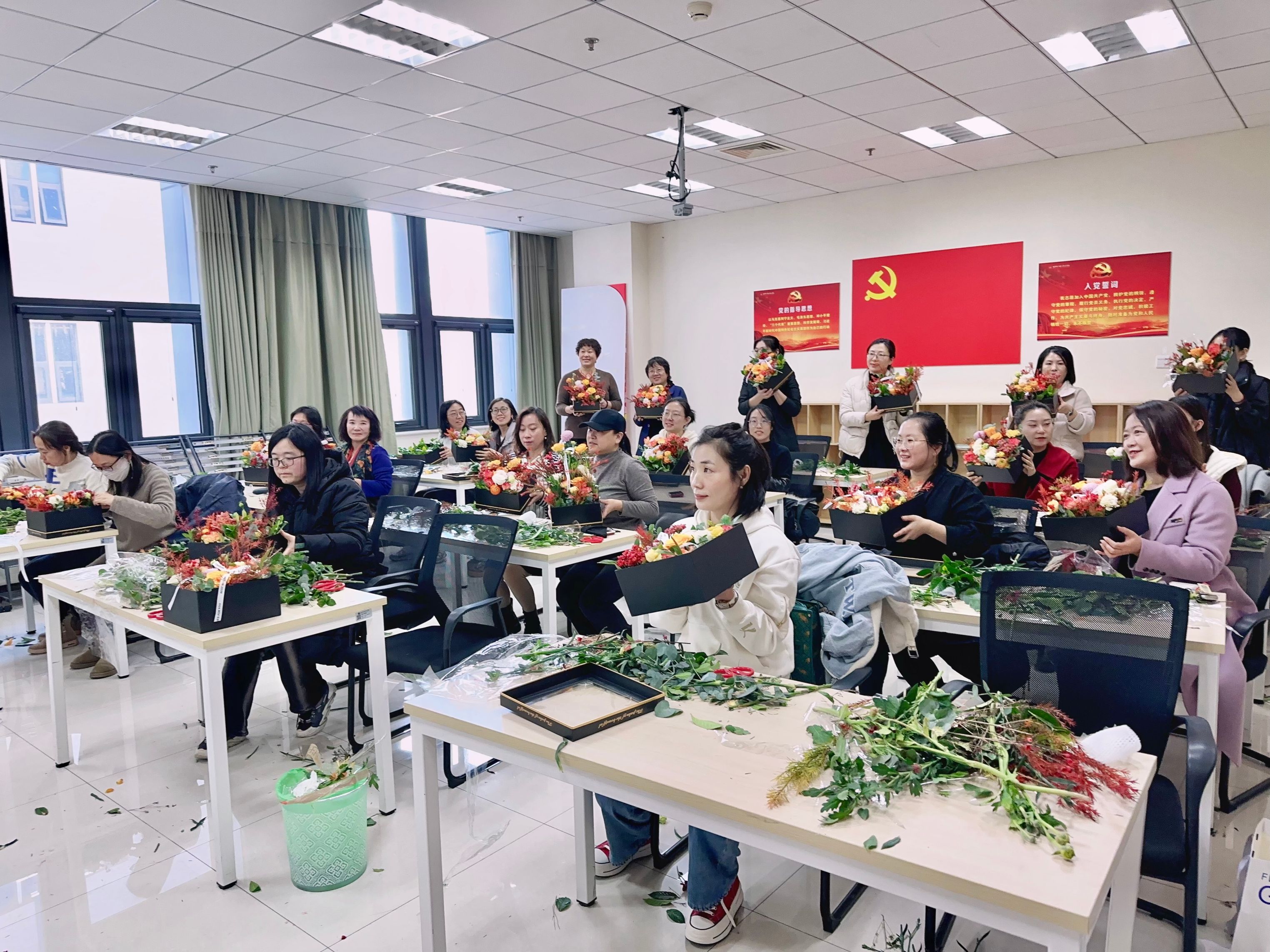 为庆祝三八国际妇女节,丰富女职工文化生活,2024年3月7日下午,校工会在学校工会之家205组织女职工开展了艺术插花活动,共有近30名女职工参加本次活动。