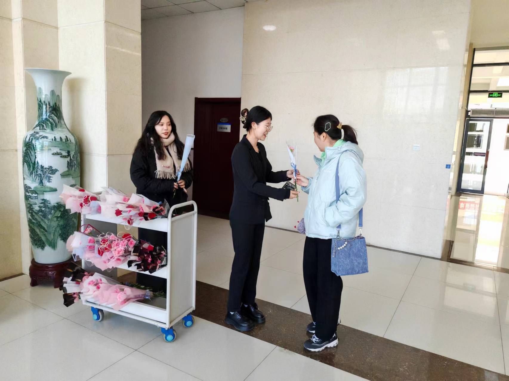 人间三月,春意盎然,春风十里,鲜花绽放,最美是“你”。伴随着明媚的阳光和温暖的春风,在第114个国际妇女节来临之际,为了让全校女教职工度过一个充满爱心与温情的节日,3月8日上午,由后勤基建处党员同志组成的“爱心团”在行政楼前为女教职工送上精美的鲜花,并致以节日的慰问和真诚的祝福。