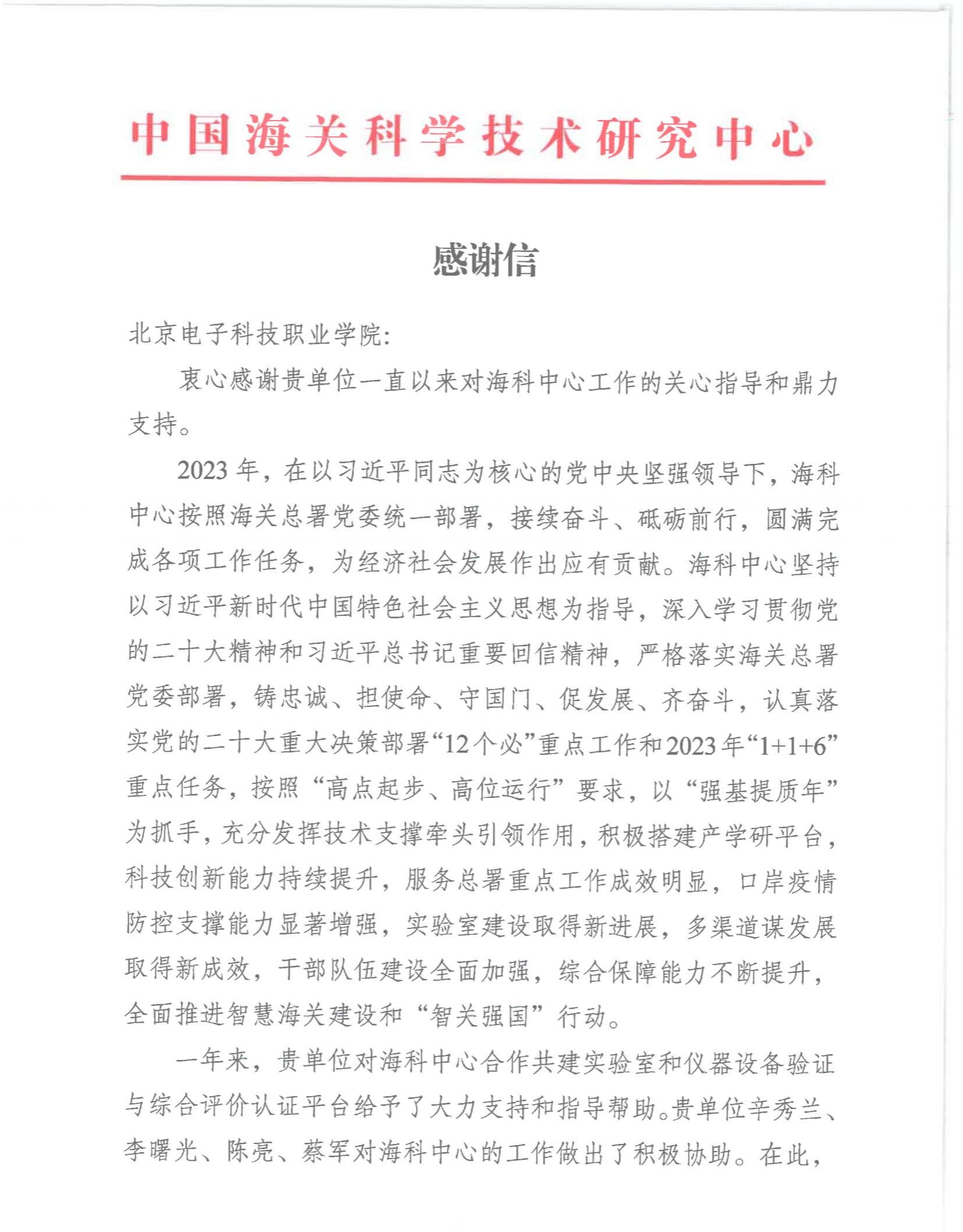 近年来,北京电子科技职业学院(以下简称“北电科”)与中国海关科学技术研究中心(以下简称“海科中心”)合作共建生物检验检测技术协同创新工作室,这一重要合作得到了海科中心的高度认可,并收到了来自海科中心的感谢信。