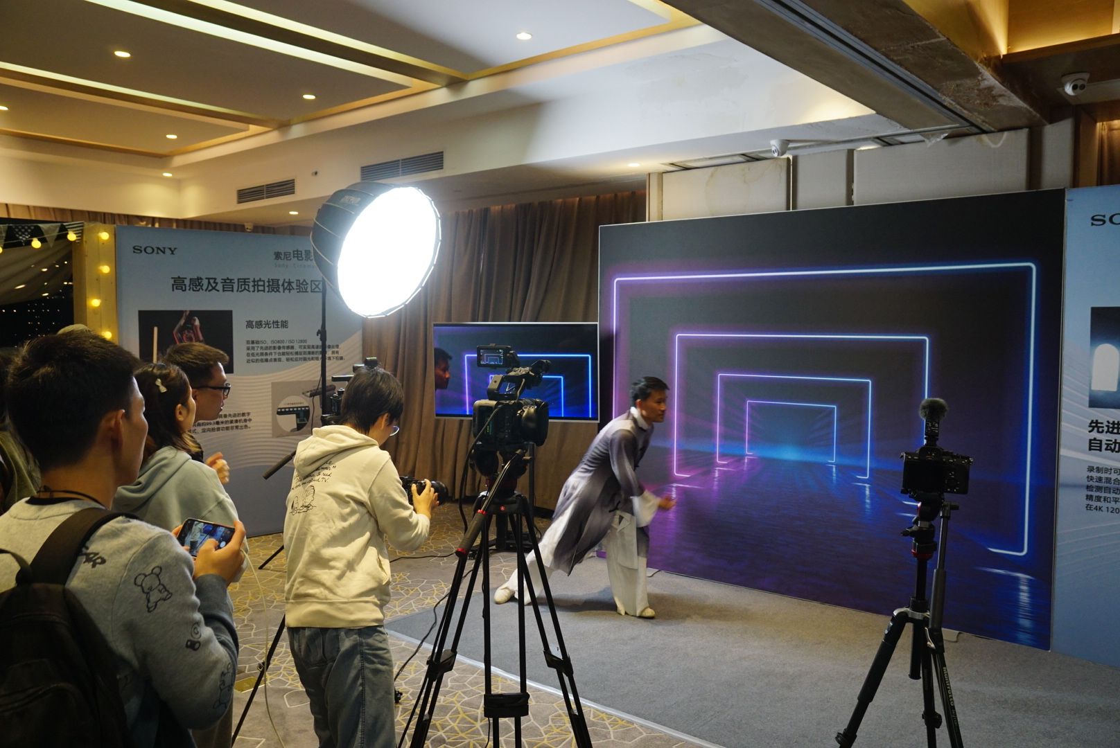 本次活动是索尼电影感创作坊系列活动北京站,旨在介绍最新的索尼摄影摄像解决方案,并开展现场体验、拍摄时间和技术交流活动。在这次活动中,学生充分领略了当前影视行业在影像设备、采集制作、协同制作方案等领域的各类技术的最新发展成果,开拓了眼界。活动中大型纪录片《功勋——国家先锋》总导演、大型纪录片《一路百年》总导演邢川先生与学生分享交流了纪录片的创作流程、拍摄以及设备运用经验。活动现场搭建了高感及音质体验区、静物拍摄区、升格拍摄区、运动拍摄区、电影感抓拍体验区等拍摄场景,孙磊老师给学生做了拍摄指导和讲解。