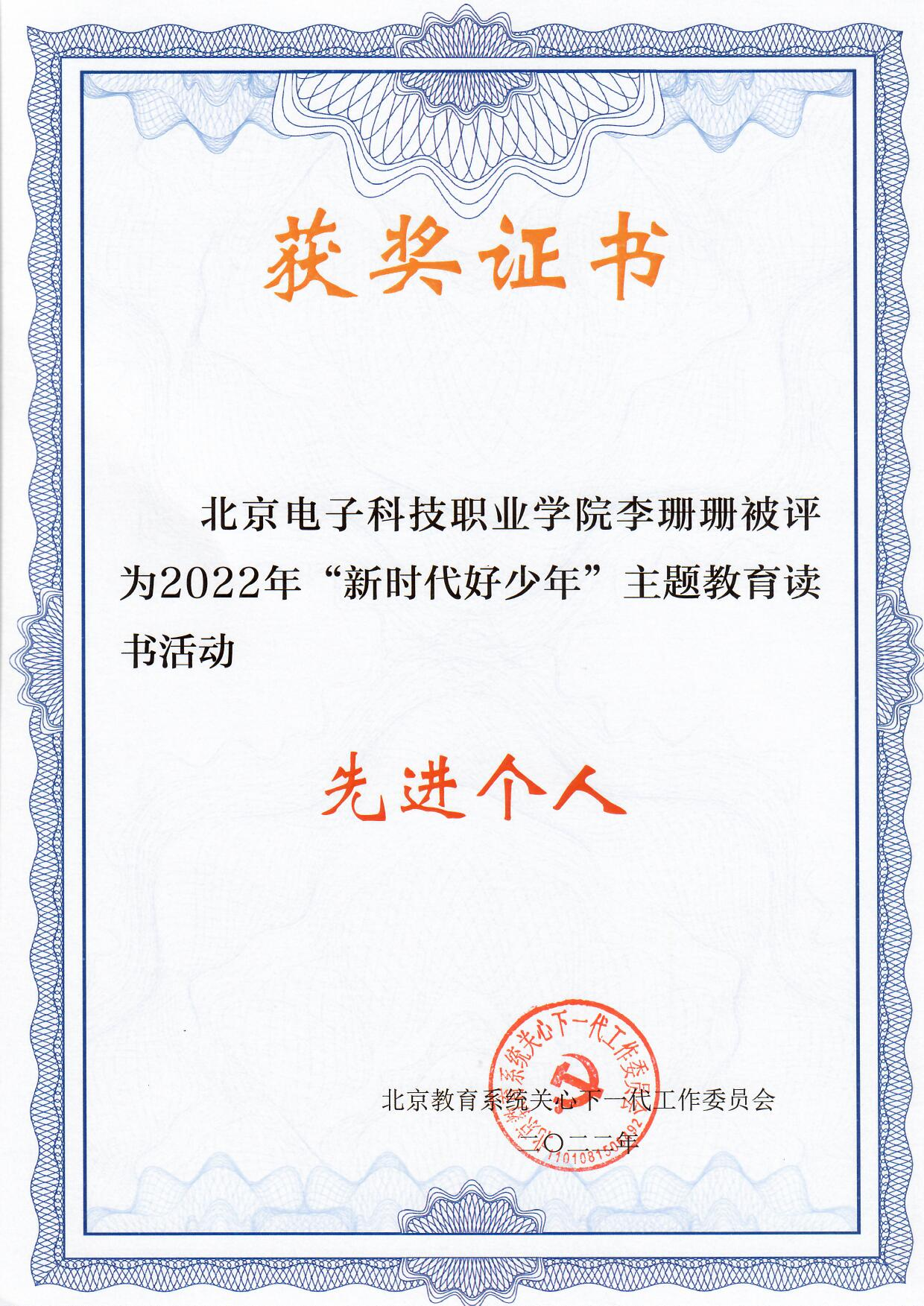 学校关工委荣获北京教育系统关工委2022年“新时代好少年”主题教育读书活动先进集体。