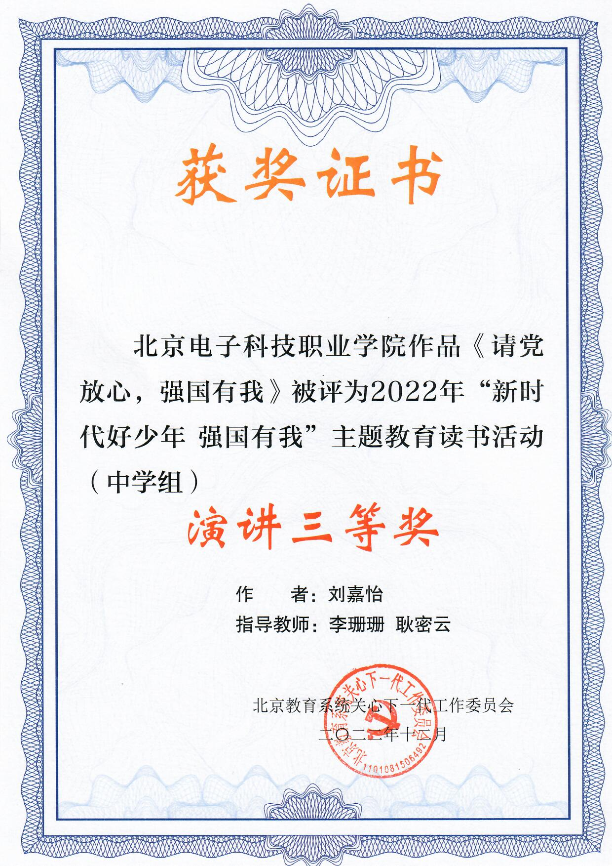 基础教育学院分团委书记、关工委秘书长李珊珊荣获北京教育系统关工委2022年“新时代好少年”主题教育读书活动先进个人。经济管理学院贯通学生刘嘉怡(指导教师李珊珊、耿密云)演讲作品《请党放心,强国有我》荣获北京教育系统关工委2022年“新时代好少年 强国有我”主题教育读书活动(中学组)演讲三等奖。