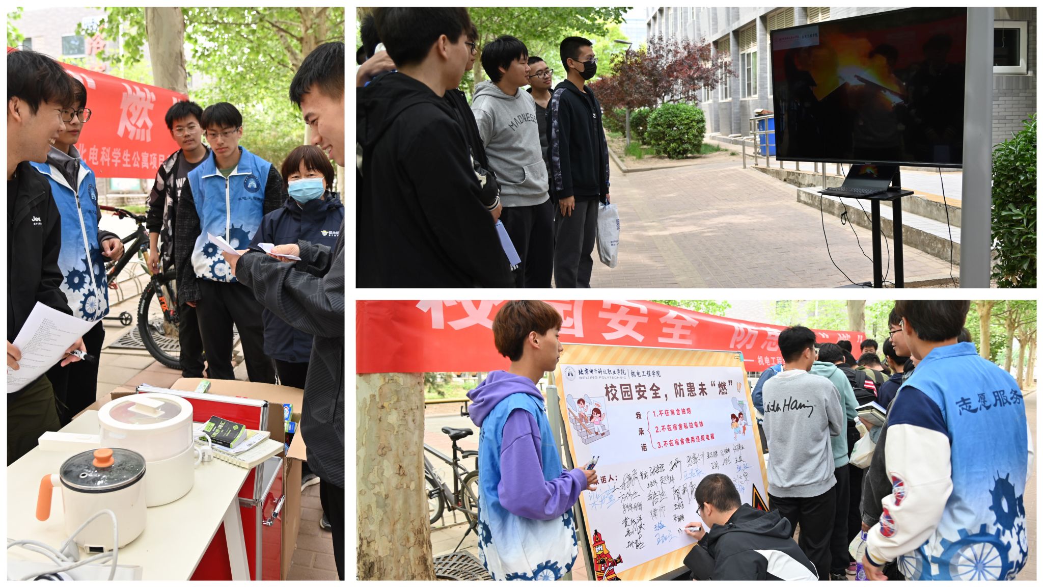 4月23日,活动在学校E座学生公寓楼下举行。学生志愿者们向前来参加活动的同学介绍各种各样违规电器可能带来的安全隐患,大屏幕滚动播放用电安全、网络安全、人身财产安全等案例警示和提醒内容;学生在签名板上郑重写下自己安全用电的承诺——不在宿舍抽烟、私拉电线和使用违规电器;数百名学生积极踊跃参与了宿舍安全相关问题的有奖竞答活动。在寓教于乐的多种形式中同学们收获了用电知识,也提升了安全意识,提高了自我保护和自我防范能力。