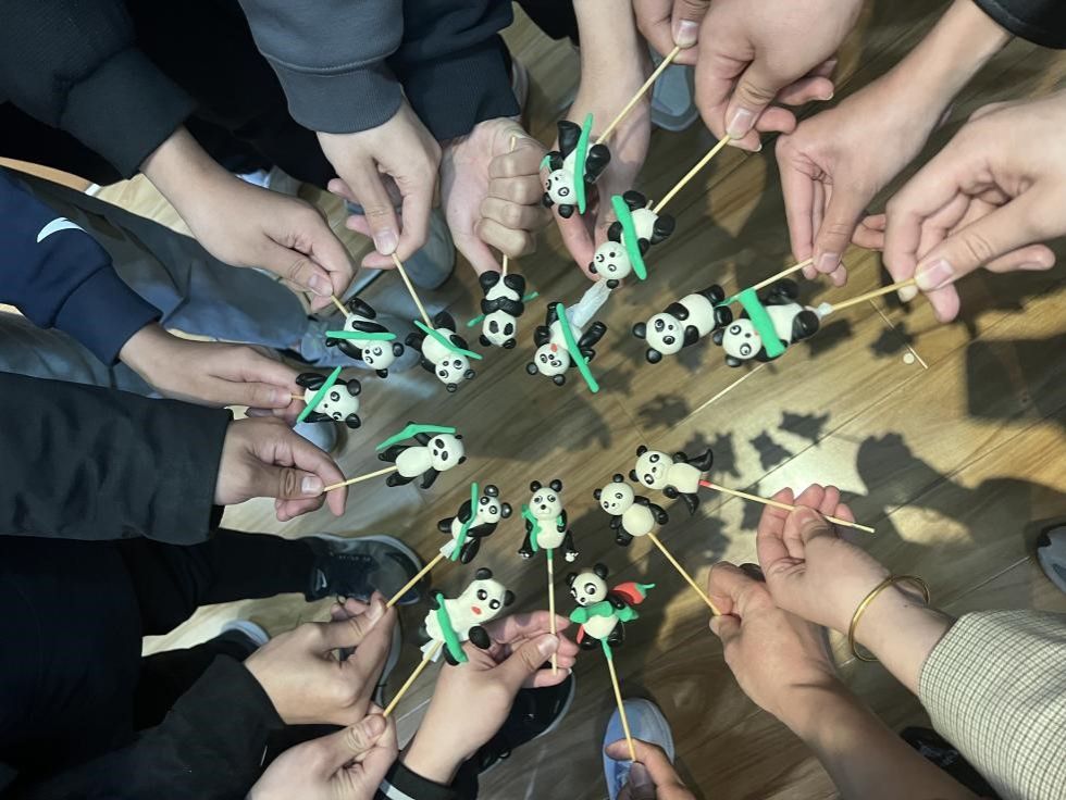 马宏丽图文并茂地向大家介绍了面塑文化的发展历史、面塑的制作材料以及自己多年从事面塑制作的经历,现场教学指导同学们如何制作面塑熊猫。看似简单的“黑白搭配”,实则需要很多技巧才能使得熊猫的形态活灵活现。体验过程中,首次接触面塑的同学们认真观察马老师的动作,不放过任何一个细节。经过热烈讨论后细致认真的捏制,一个个形象逼真、生机勃勃的熊猫呈现在眼前。看到自己的作品,大家纷纷感慨,做出大致的样子是一回事,做得精美、做得惟妙惟肖可太难了。