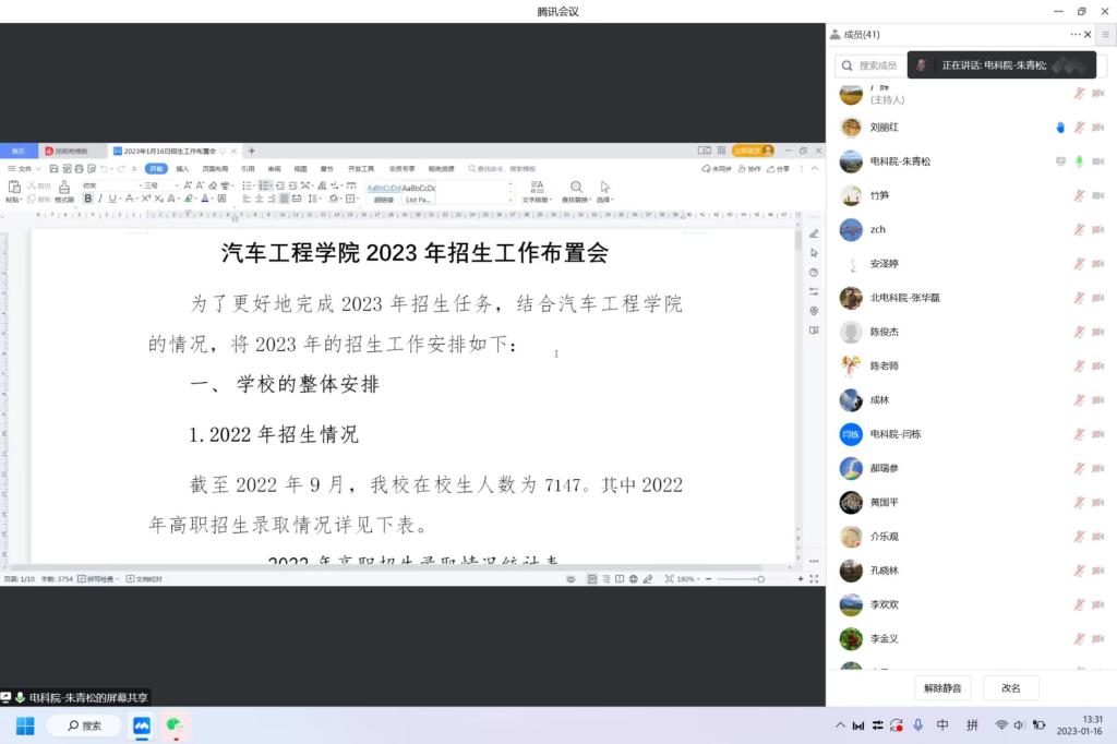 1月16日下午,汽车工程学院组织召开了2023年招生工作专题会,副院长辛秀兰、招生就业处处长张颢、副处长夏新生应邀出席,学院班子成员、系部主任、党支部书记、招生骨干教师等参加,会议由汽车工程学院院长朱青松主持。