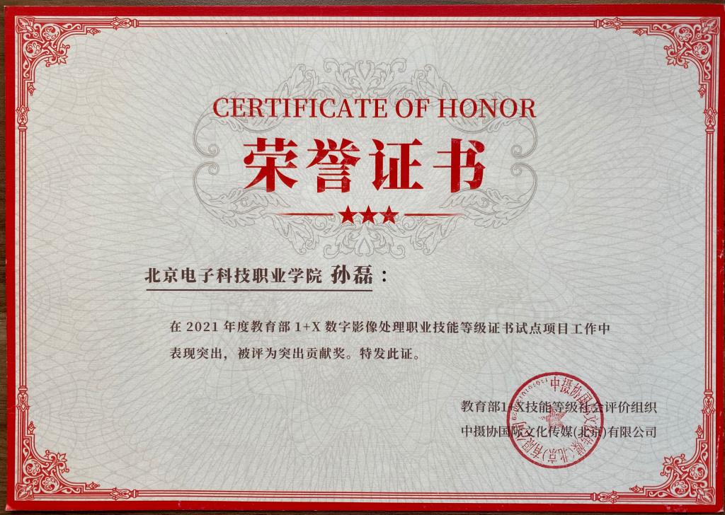孙磊受聘为考评专家组委员,是对其教研能力的高度肯定,也是对艺术设计学院组织开展1+X数字影像处理职业技能证书试点工作的肯定。成为专家组委员之后,孙磊将组织开展北京地区院校1+X数字影像处理中级认证考评工作,并以此为契机加强与兄弟院校的专业合作和交流,扩大传媒艺术专业在北京同类专业中的影响。