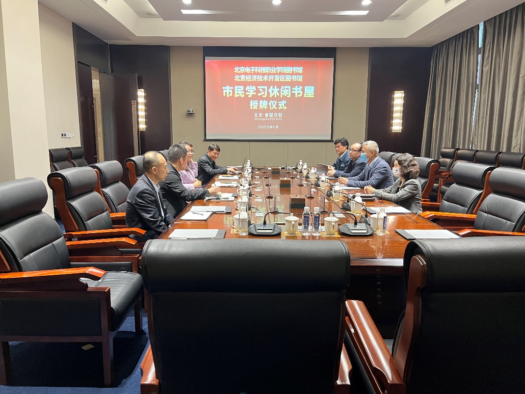 2022年10月14日下午,北京电子科技职业学院图书馆市民学习休闲书屋授牌仪式在亦庄新城北京壹号总部举行。学校图书馆馆长苏东海、经济管理学院党总支书记崔靖宇、图书馆副馆长徐红勤及相关工作人员,北京壹号总部总经理郭卫及产业运营相关负责人等参加了本次活动。郭卫女士代表公司产业运营方,向出席嘉宾致欢迎辞。