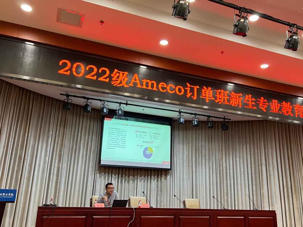 Ameco人力资源部部长杨磊向全体Ameco订单班新生、班主任和辅导员介绍了Ameco企业文化,用浅显易懂的例子阐述了飞机维修专业精髓,和同学们未来的职业发展及前景。