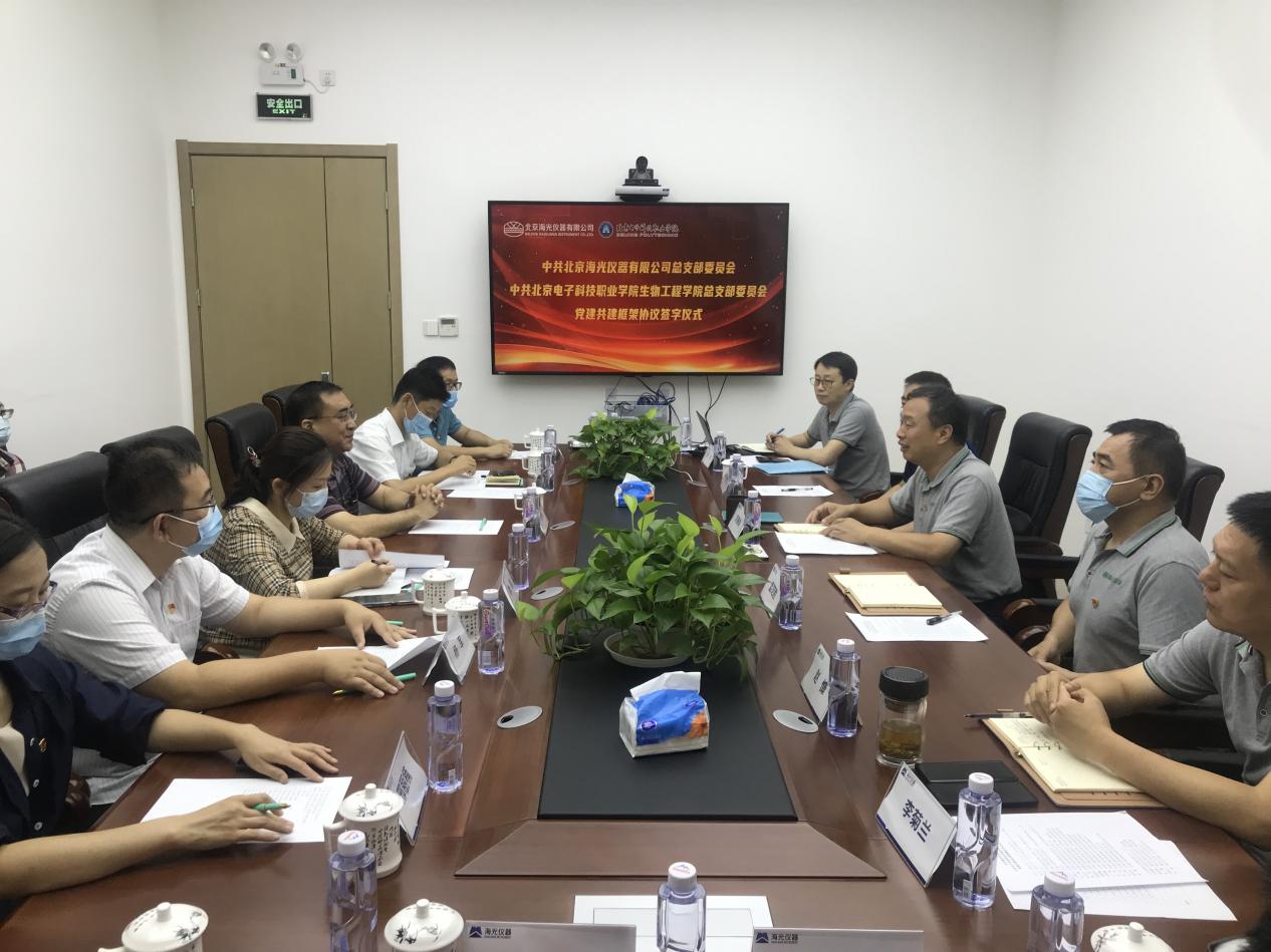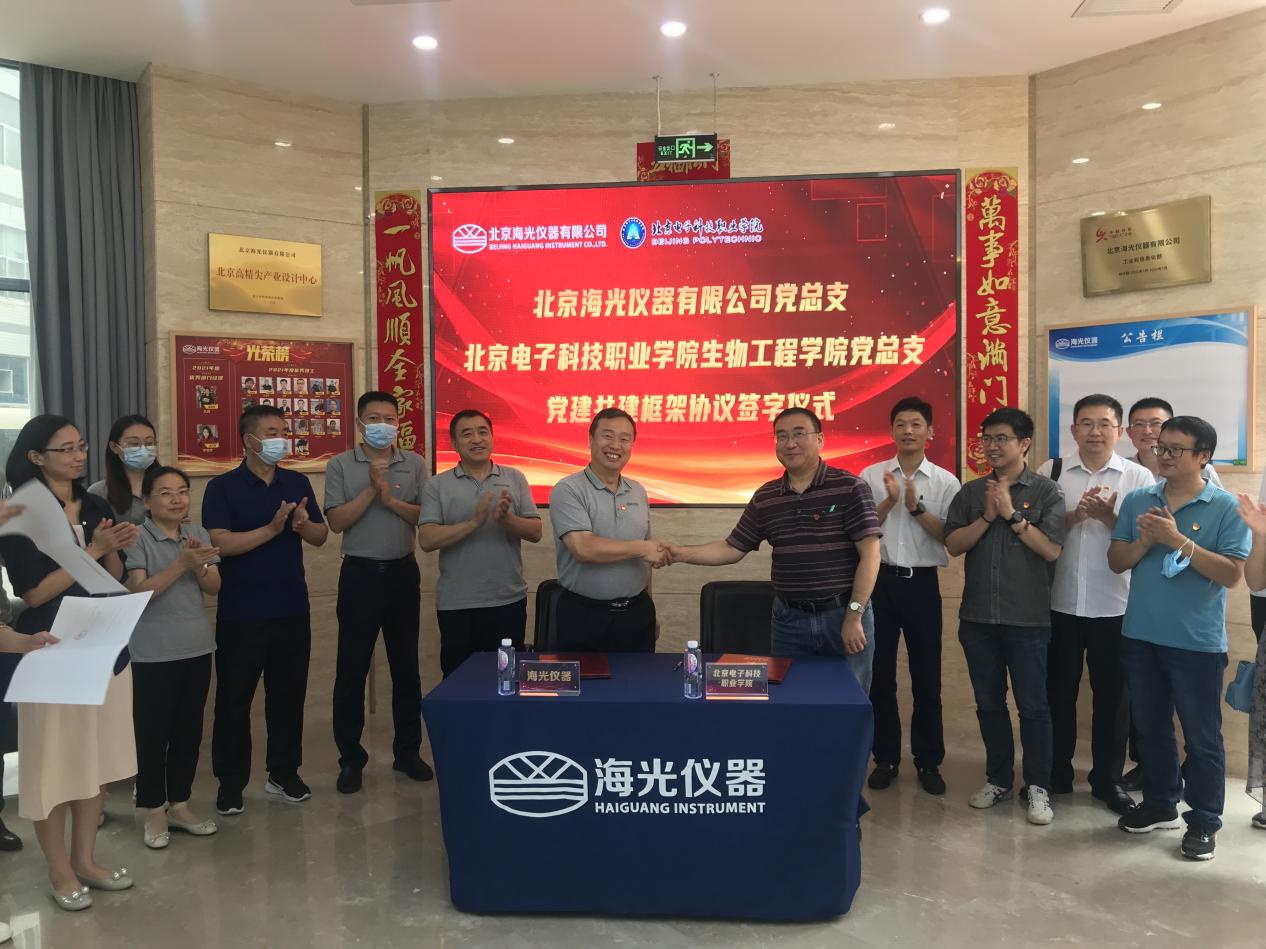 生物技术系党支部、食品技术系党支部、环境技术系党支部分别与北京海光仪器有限公司第一党支部、第二党支部,北京奥地探测仪器有限公司党支部签署支部共建协议,开展红色“1+1”主题党日活动,就支部建设进行深入探讨。
